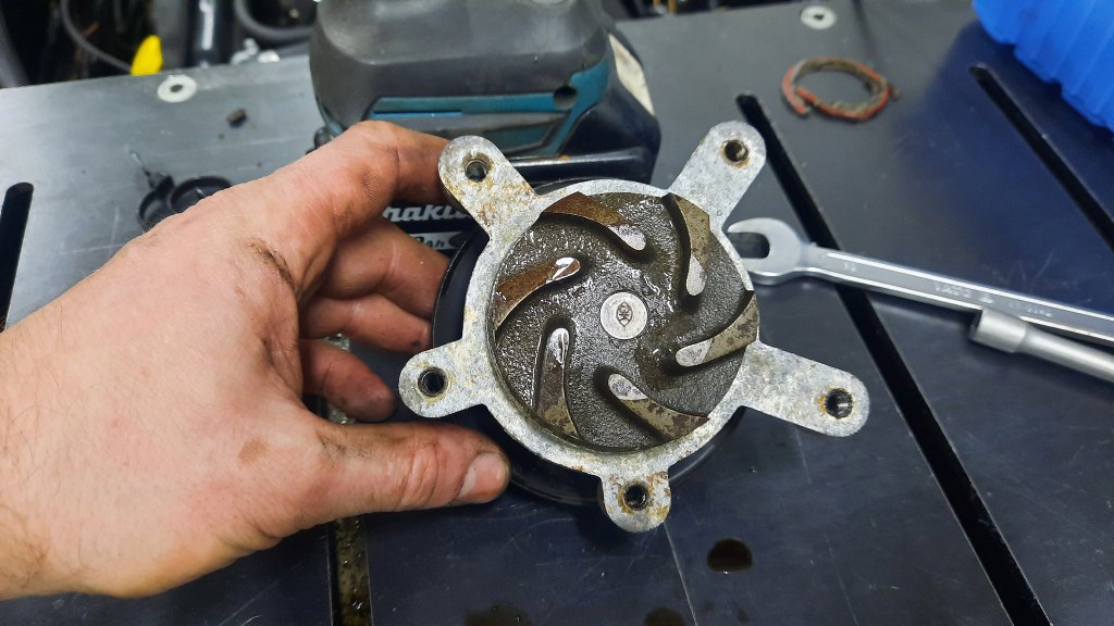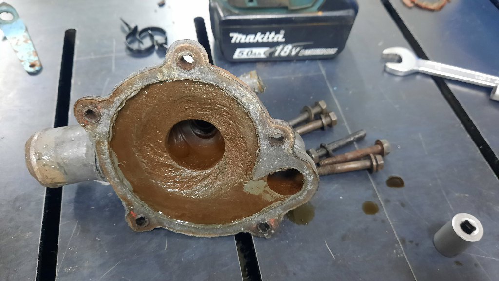 Zdjąłem też pokrywę tylną pompy wody. Podobnie jak pokrywka termostatu, też jest mocno skorodowana.
