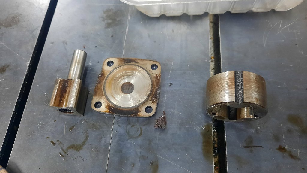 Co ciekawe, na wirniku widać ślady, że długo stała ze starym olejem. Na reszcie płaszczyzn są bardzo mocne rysy. Ta pompa to już złom, musiała większość tych opiłków przepuścić przez siebie.
