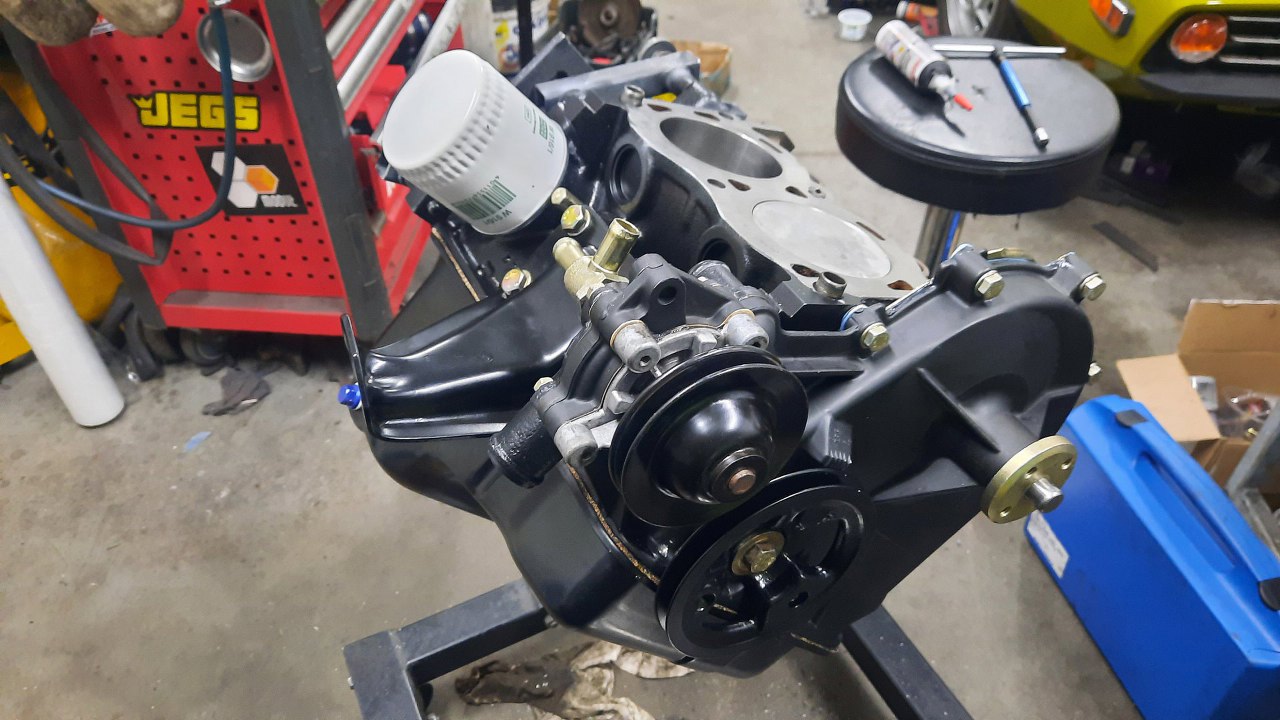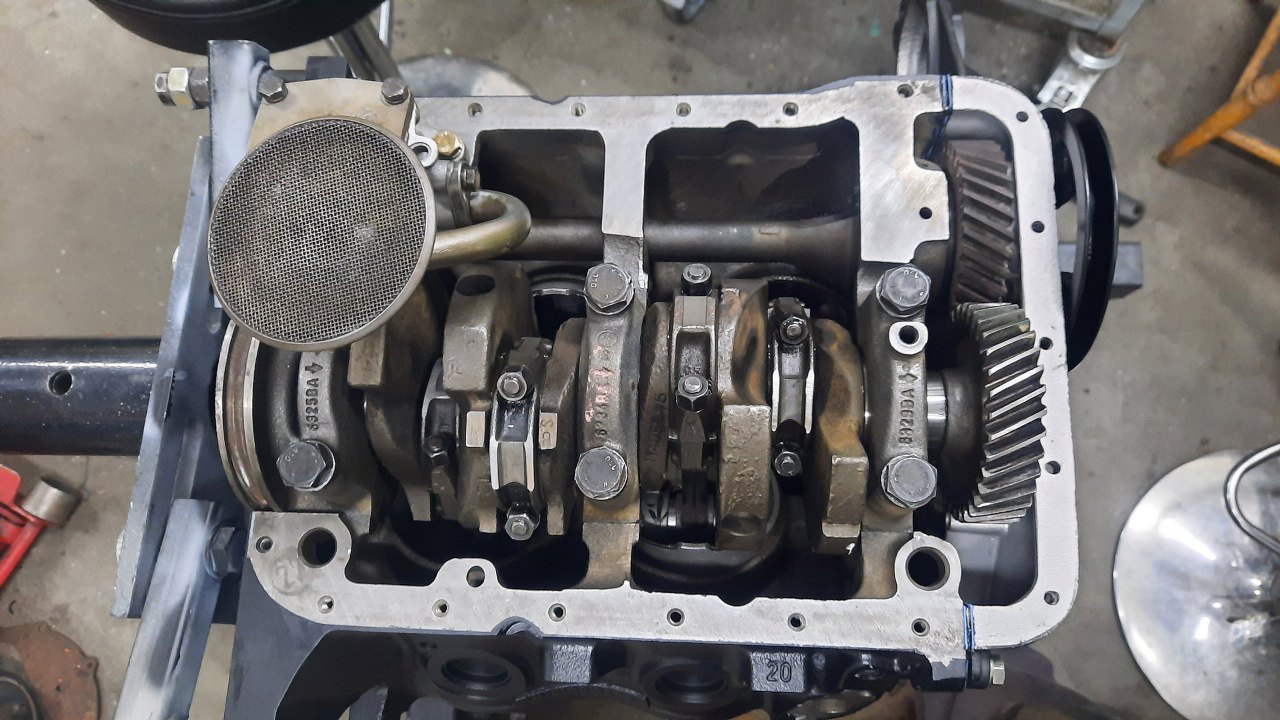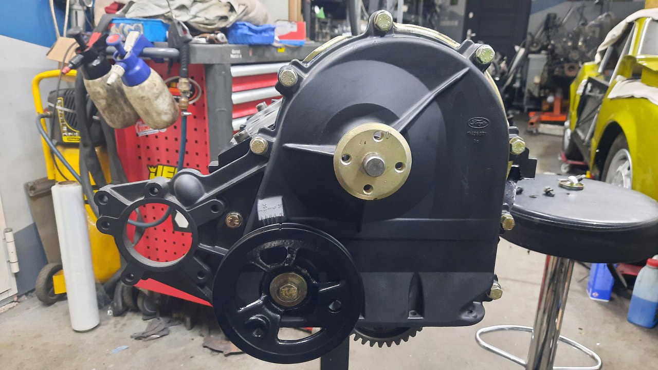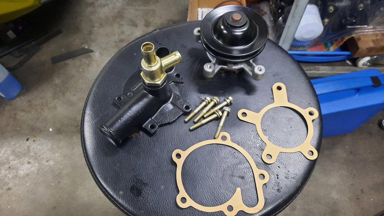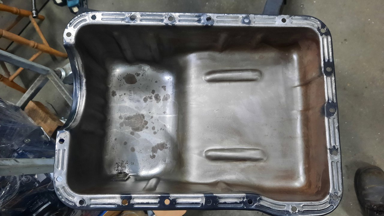 Z tej strony bloku jest jeszcze przykręcona pompa wodu i jej tylna pokrywa. Pompa wody wygląda na wymienianą niedawno, dlatego spróbuję ją zostawić. Czasem pompa w idealnym stanie po chwili nieużywania potrafi cieknąć, ale może tym razem się uda i pozostanie szczelna. Tylną pokrywkę oczywiście odnowiłem, a części stalowe zostały ocynkowane.
