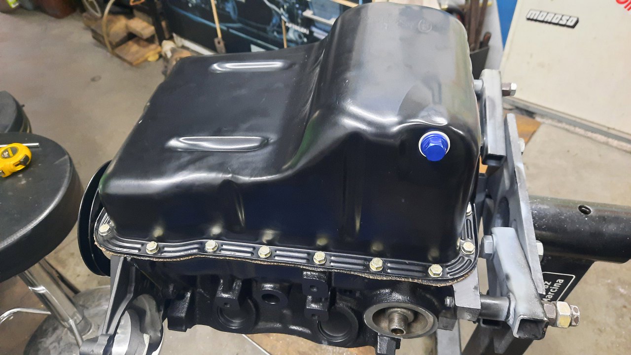 Potem przykręciłem miskę oleju. Na początku nie chciała pasować, okazało się, że lekko przeszkadza przekrzywiony smok pompy oleju. Musiałem go poprawić i dopiero dokręcić miskę. Założyłęm też nowy korek oleju.