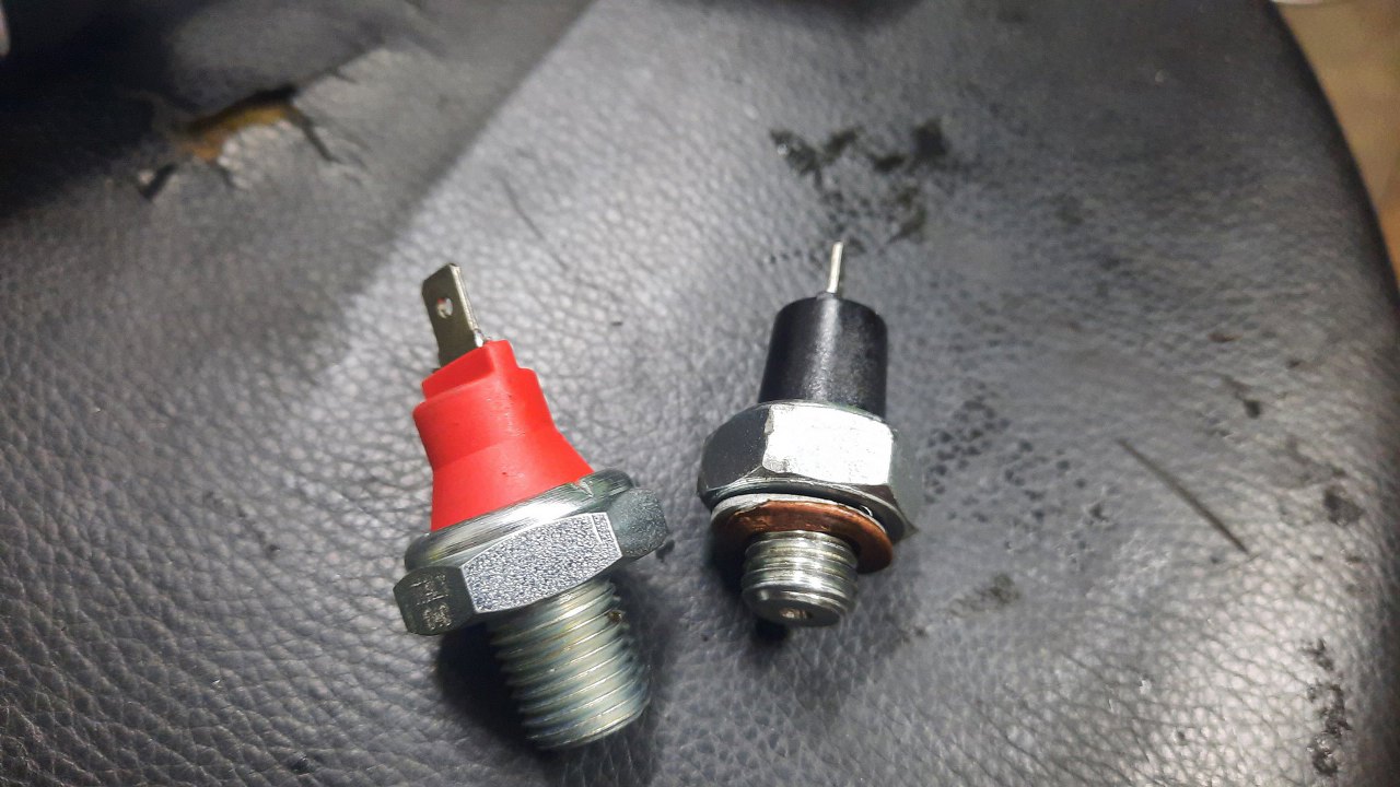 Z drugiej strony też przykręciłem łapę silnika. Miałem właśnie przykręcać czujnik ciśnienia oleju, ale podejrzany mi się wydał jego gwint. Nasi tu byli... gwint jest zupełnie inny. Z lewej strony właściwy czujnik dla porównania. Ten zmieniony gwint (bo w starym bloku jest pasujący) nic chyba nie dał, bo są założone aż dwie podkładki uszczelniające.