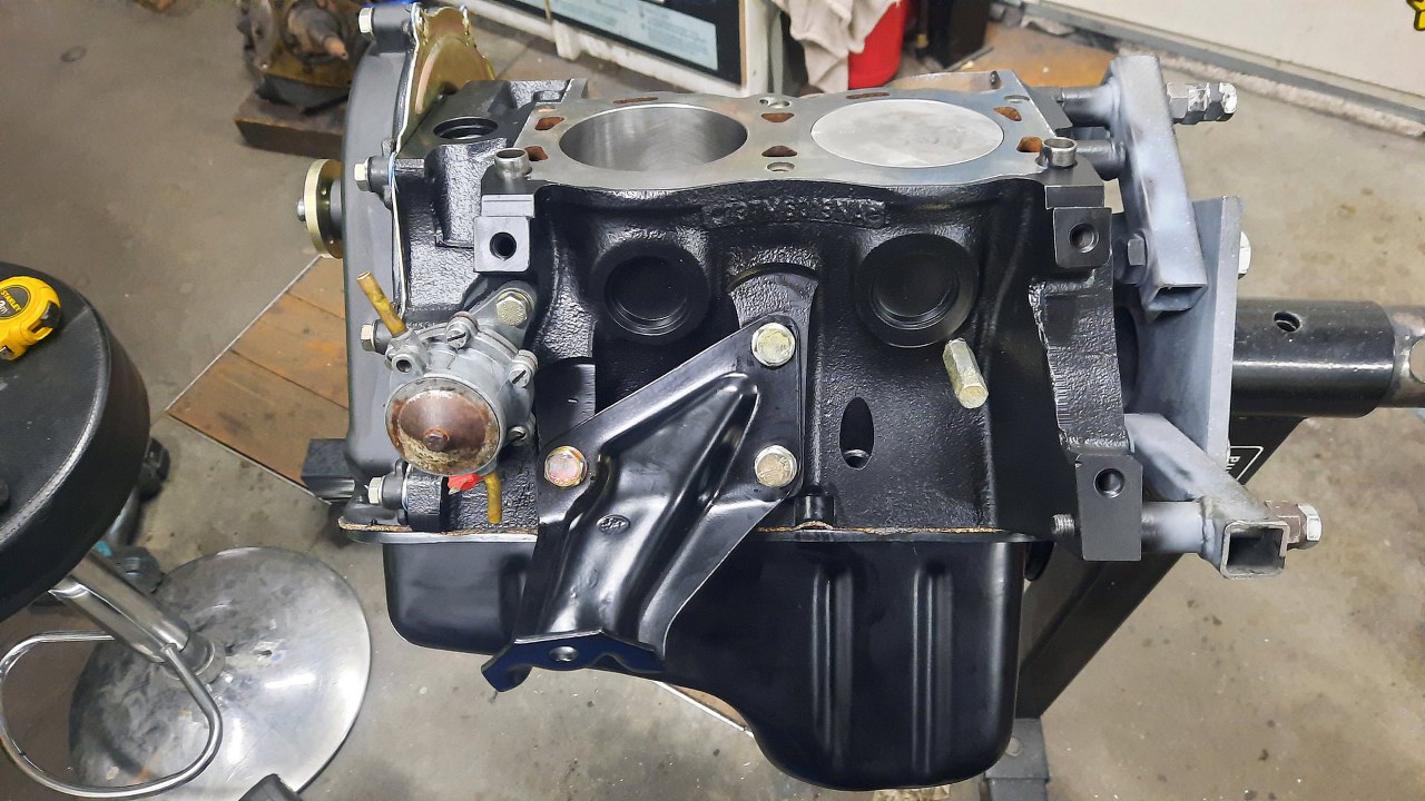 Przykręciłem filtr oleju i chciałem przykręcić łapę silnika. Oryginalnie była ona przykręcona do bloku śrubami M8. Ale w otwory w bloku wchodzą za luźno... Okazuje się, że ten blok jest już późniejszy, z okresu, w którym, dla ujednolicenia procesu produkcji, otwory na łapy silnika były już gwintowane pod śruby M10, tak samo w V4 i w V6. Bo V6 miały tylko M10 w tym miejscu. No i zmiana na śruby M10 nie jest oczywiście problemem, ale wymaga przewiercenia otworów w łapach silnika. To jest jedna z konsekwencji zmiany bloku, na szczęście drobna.