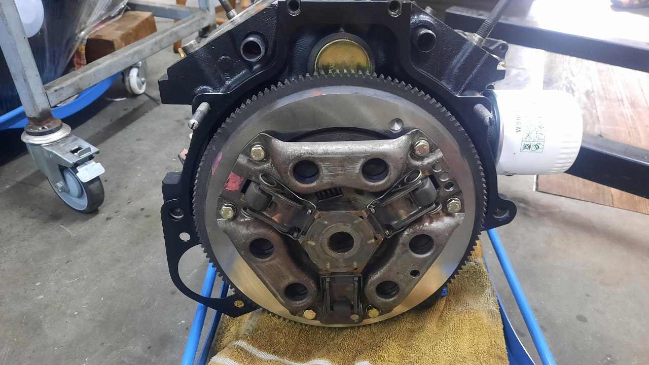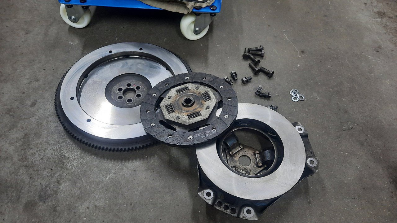 Żeby też sprzątnąć kolejne części z półki, przykręcę koło zamachowe i sprzęgło. Koło i docisk były planowane, a tarcza miała nabitą nową okładzinę.