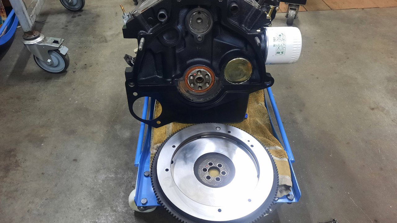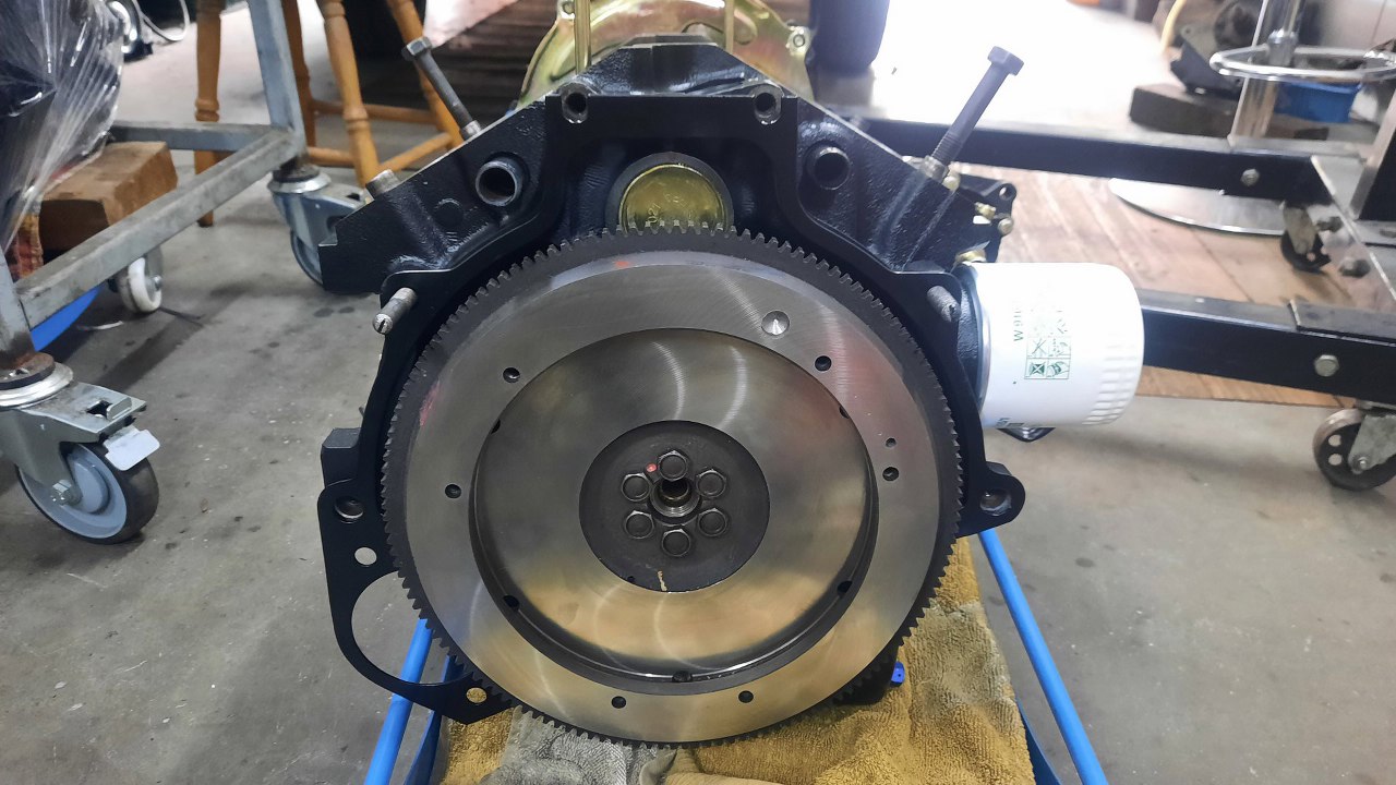 Na blok założyłem blachę pomiędzy skrzynię a silnik. Ustala ona położenie rozrusznika względem bloku. Koło zamachowe również było wyważone. Żeby trafiło na to samo miejsce, to ma między otworami na śruby nawiercone małe wgłębienie zaznaczone na czerwono, podobnie jak wał korbowy. Nie mogę jednak go tak od razu przykręcić, bo brakuje w bloku jeszcze zaślepki wałka rozrządu.