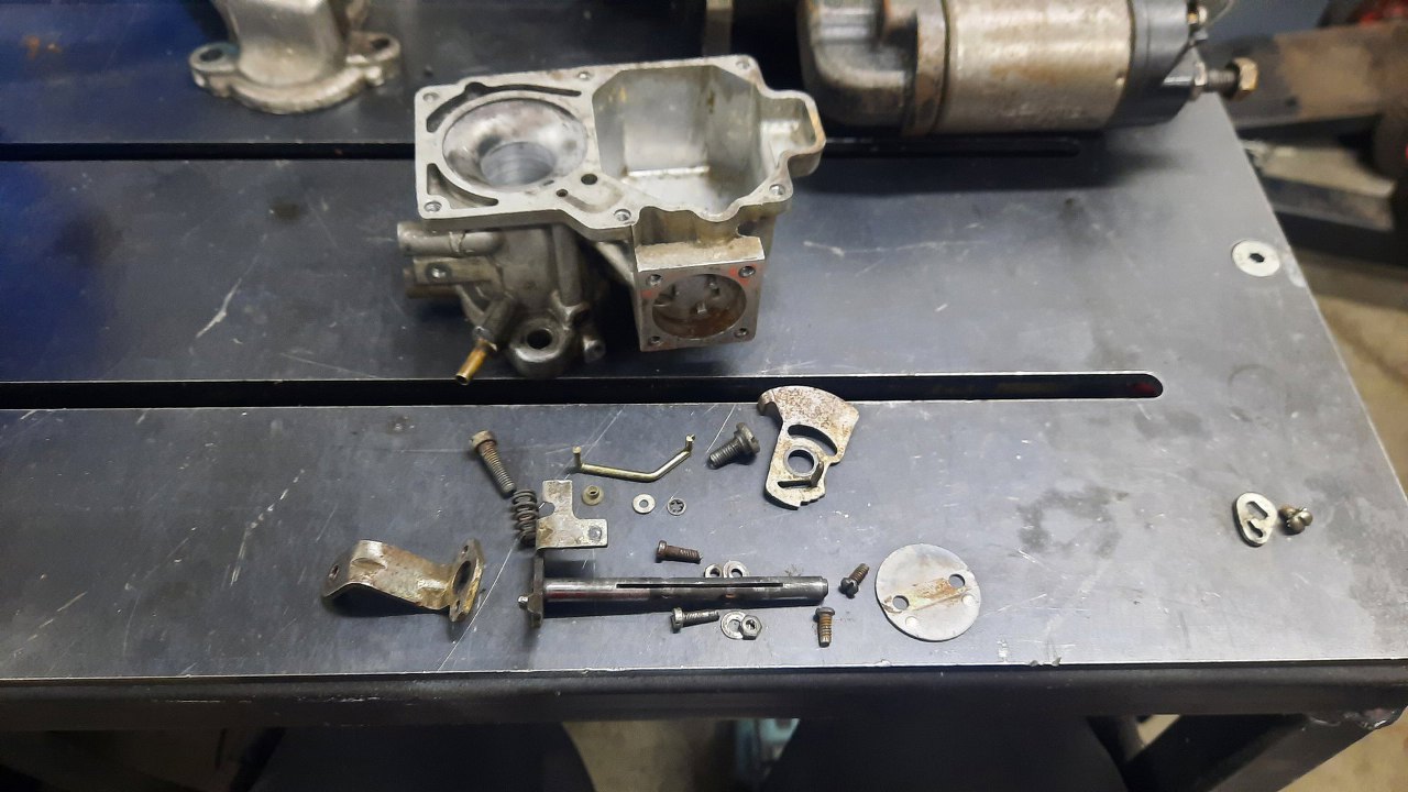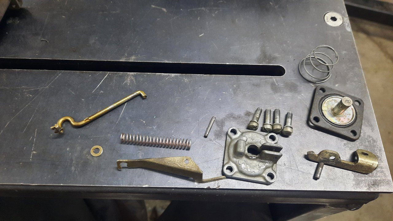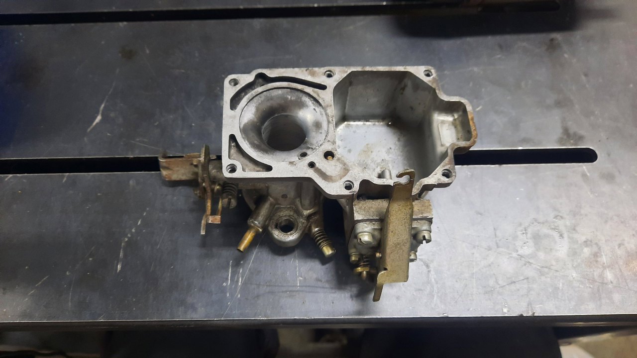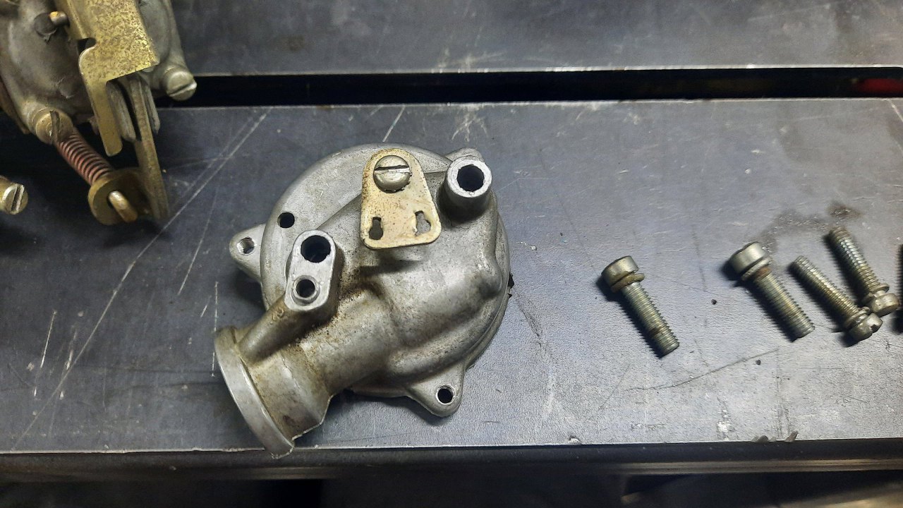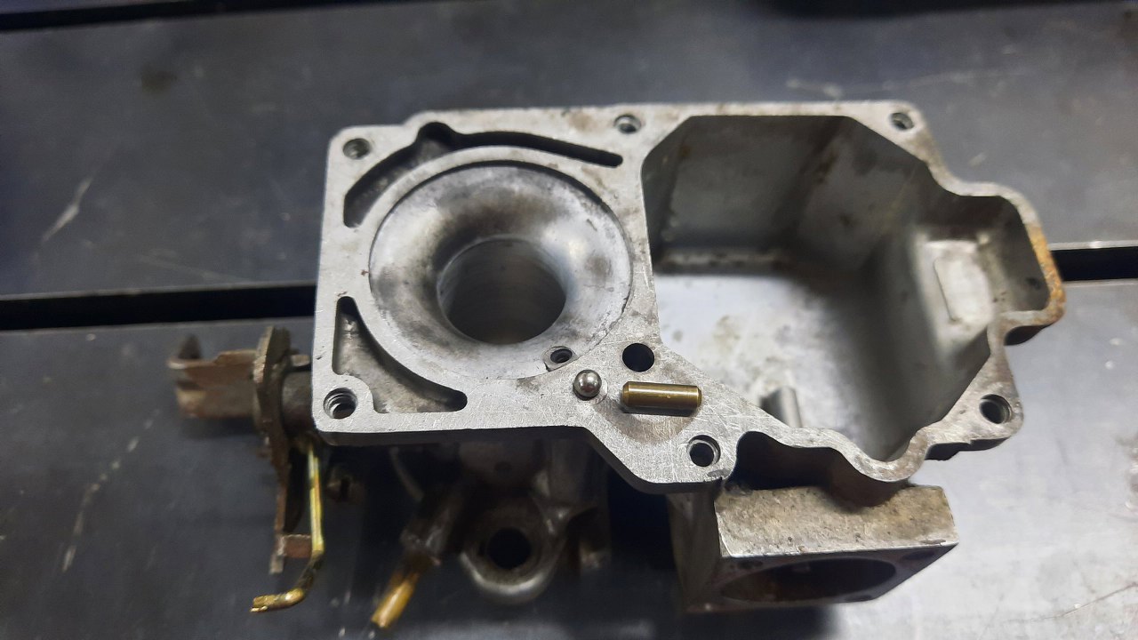 Zanim jednak się do niego dobrałem, wykręciłem korek i zaworek odmy z podstawki gaźnika. Stalowe części będą ocynkowane razem z częściami gaźnika.