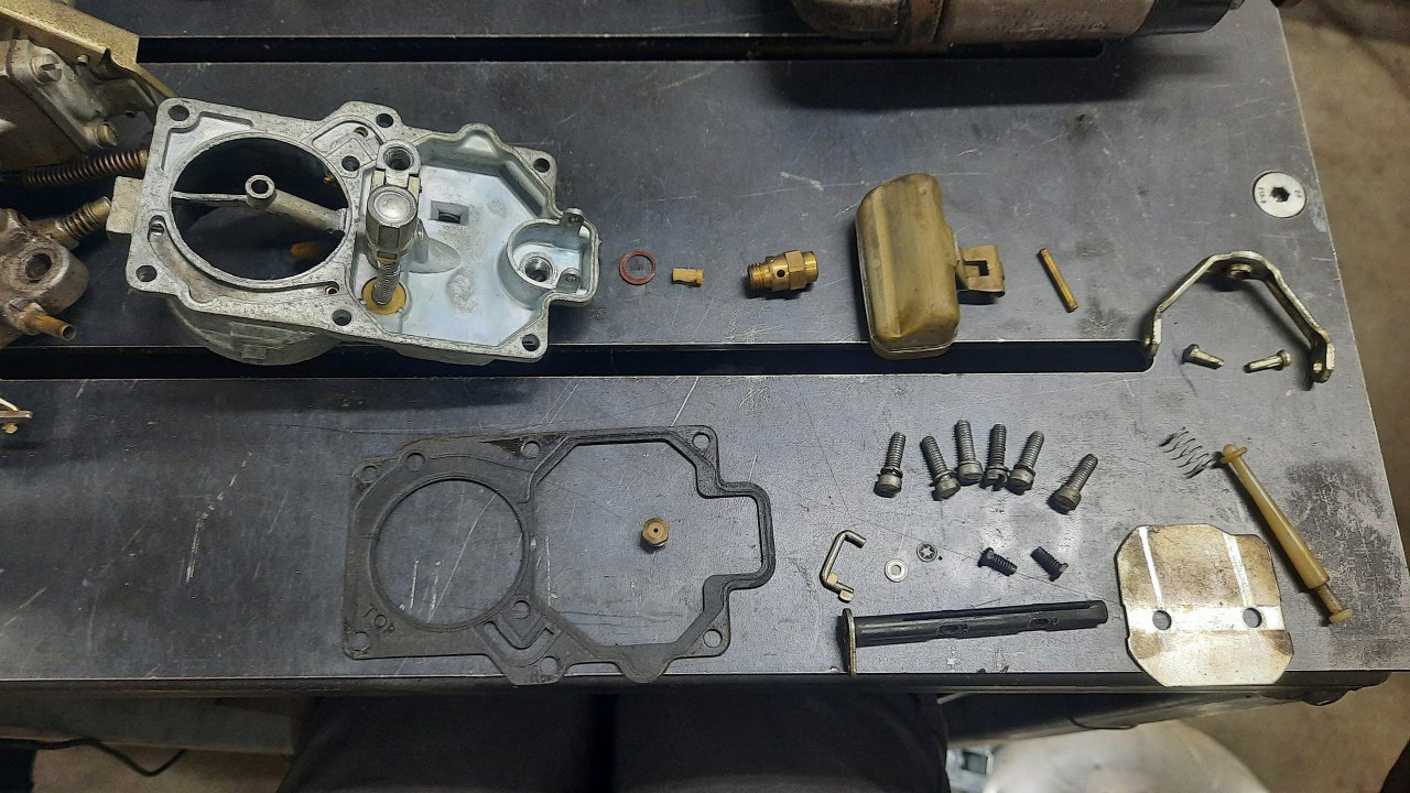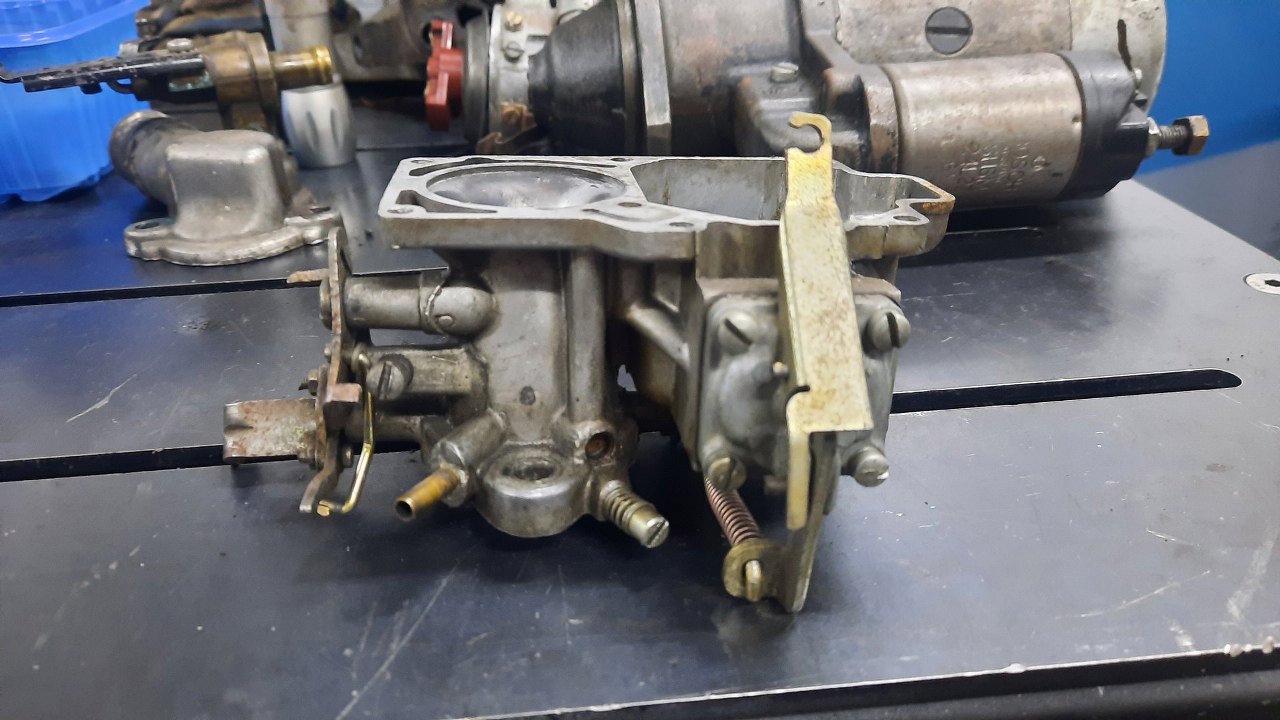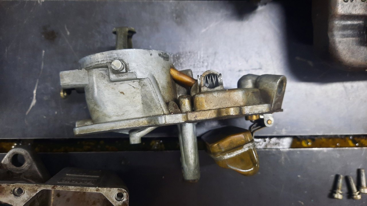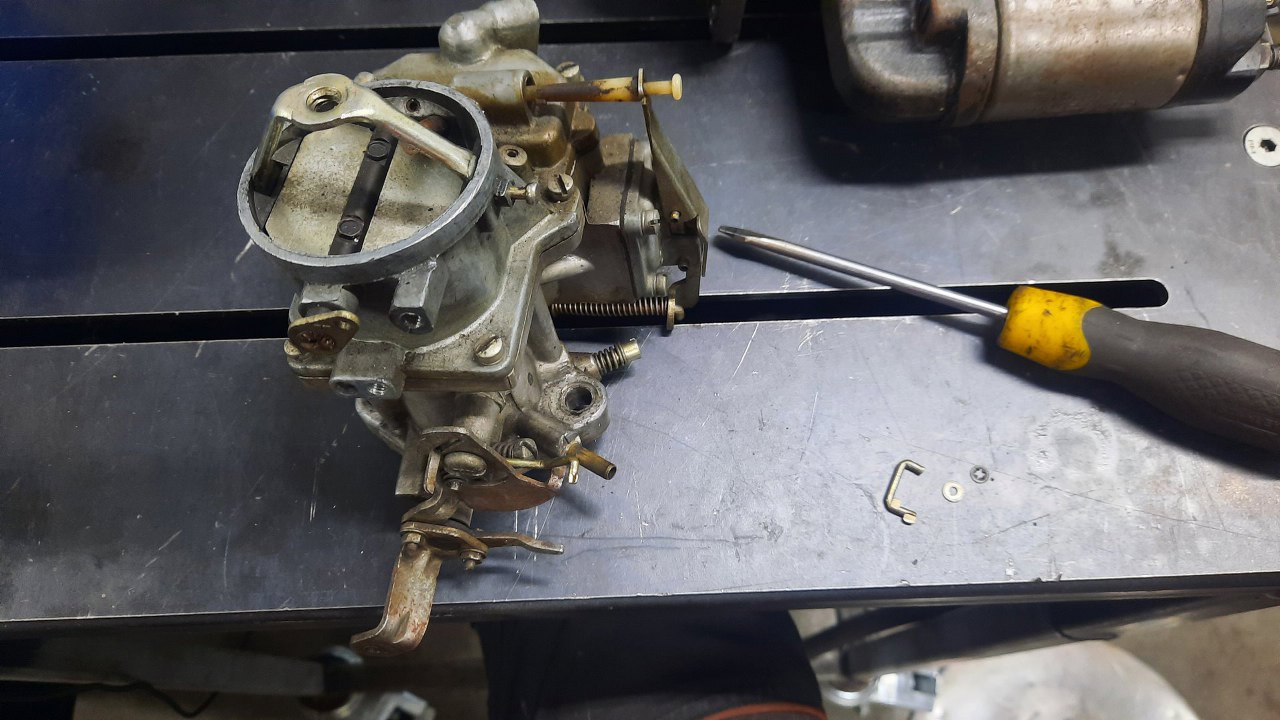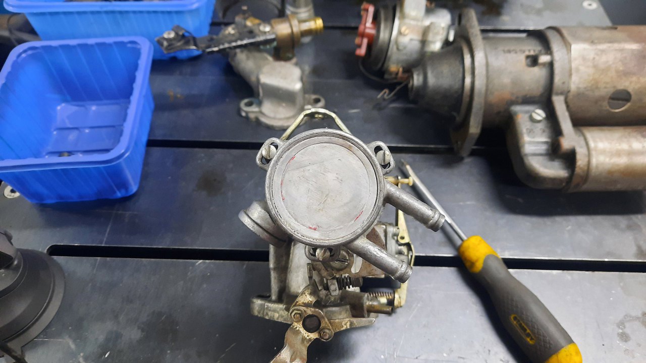 Zanim jednak się do niego dobrałem, wykręciłem korek i zaworek odmy z podstawki gaźnika. Stalowe części będą ocynkowane razem z częściami gaźnika.