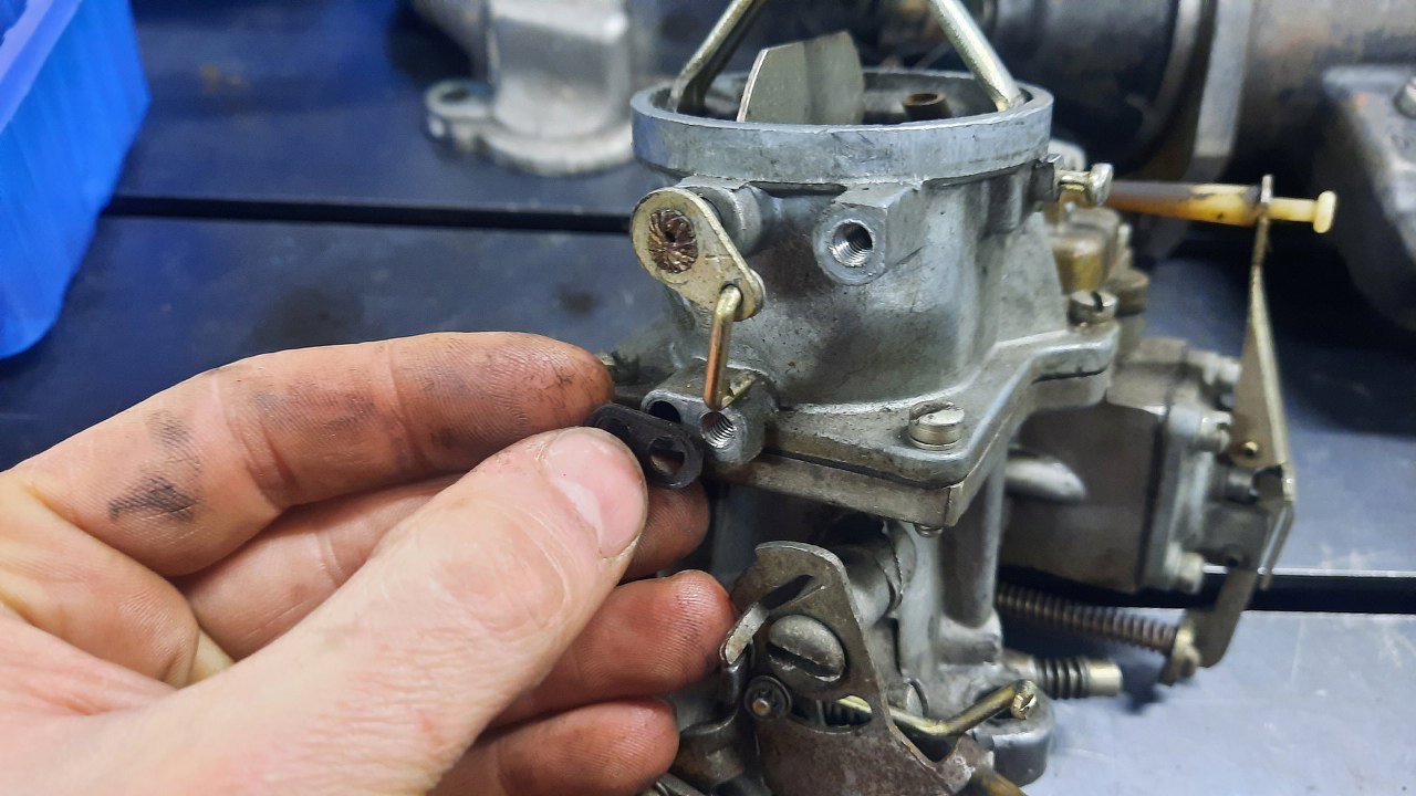 Pod komorą pływakową odkręcam blaszkę poruszającą pompką przyśpieszacza.
