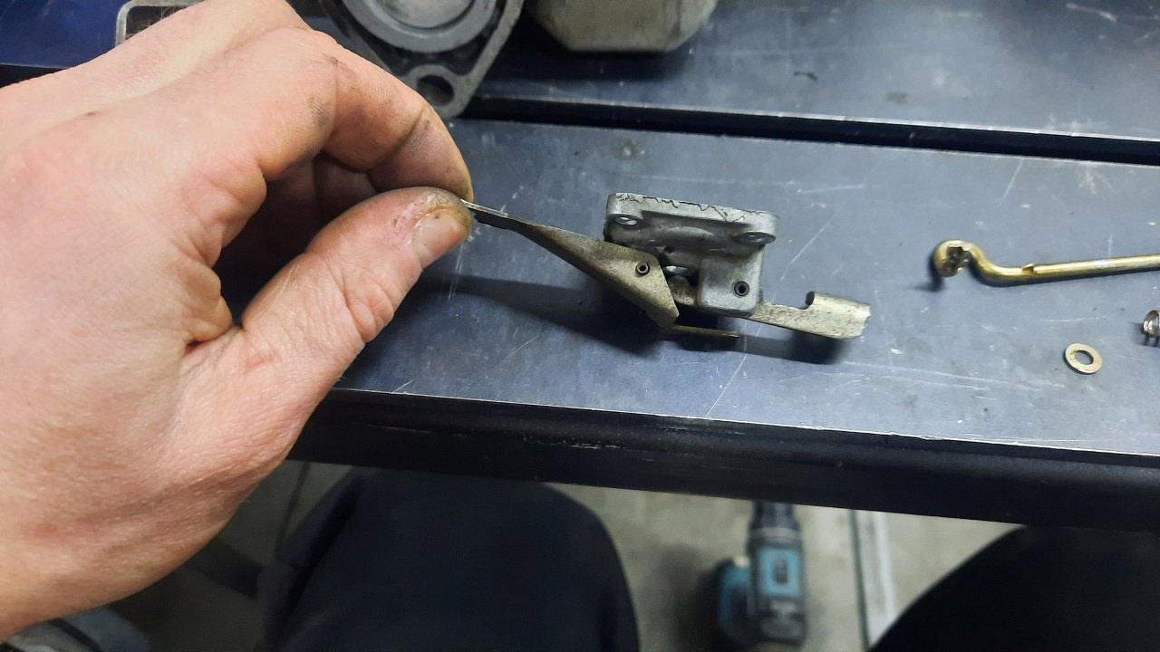 Zazwyczaj pompka przyśpieszacza ma tylko dźwignię od strony przepustnicy. Tu jest jeszcze jedna połączona z plastikiem u góry.