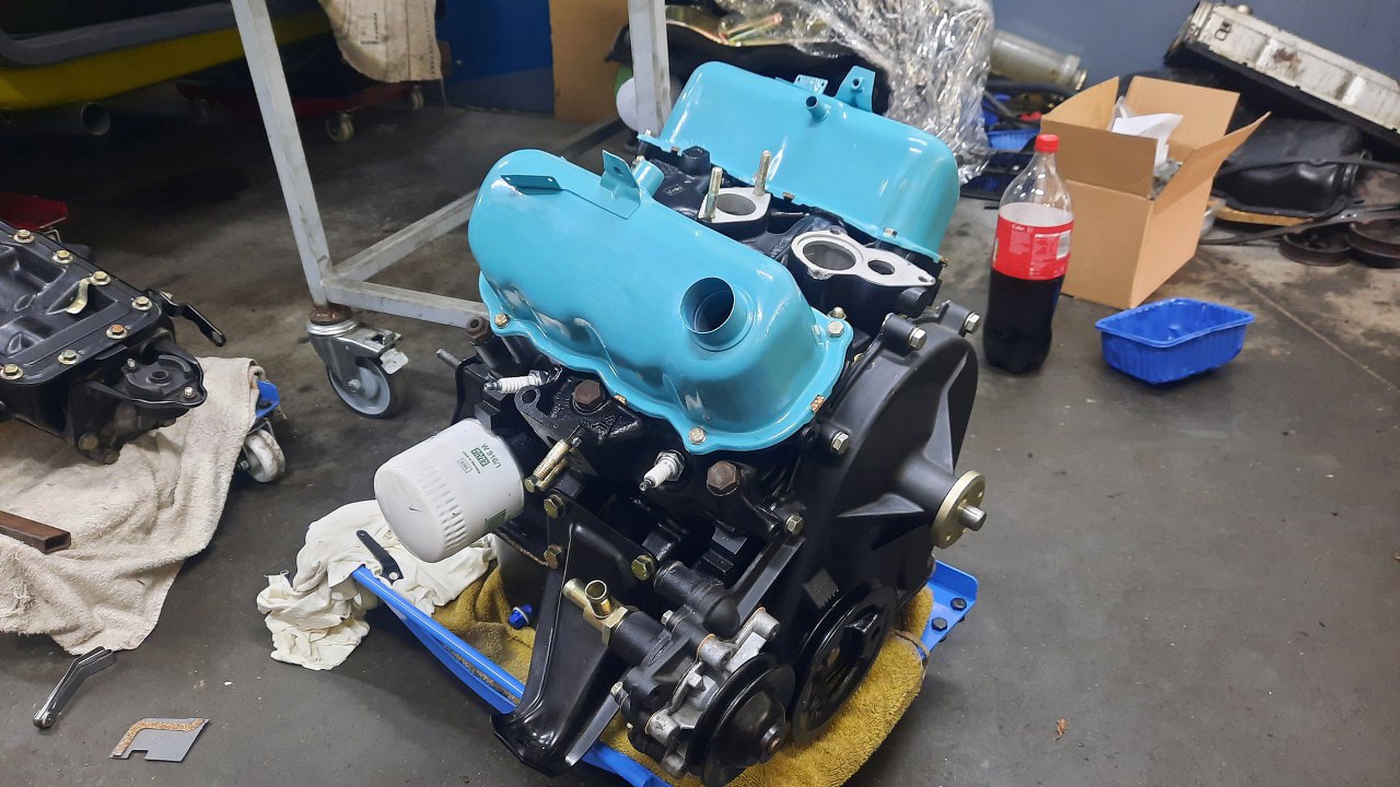 Skończyłem ostatnio na założeniu pokryw, dzięki czemu silnik zaczął wyglądać na dość kompletny. Pracuję dalej. W tle po lewej widać kawałęk skrzyni biegów... Co prawda leży do góy nogami, ale to testowałem różne pomysły do innego projektu. Skrzynię też zaraz przykręcę.