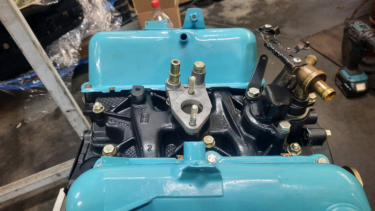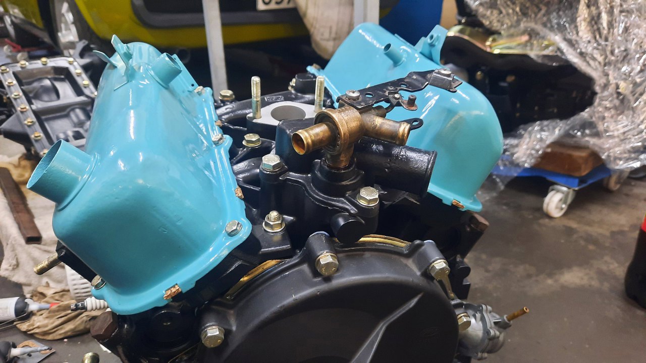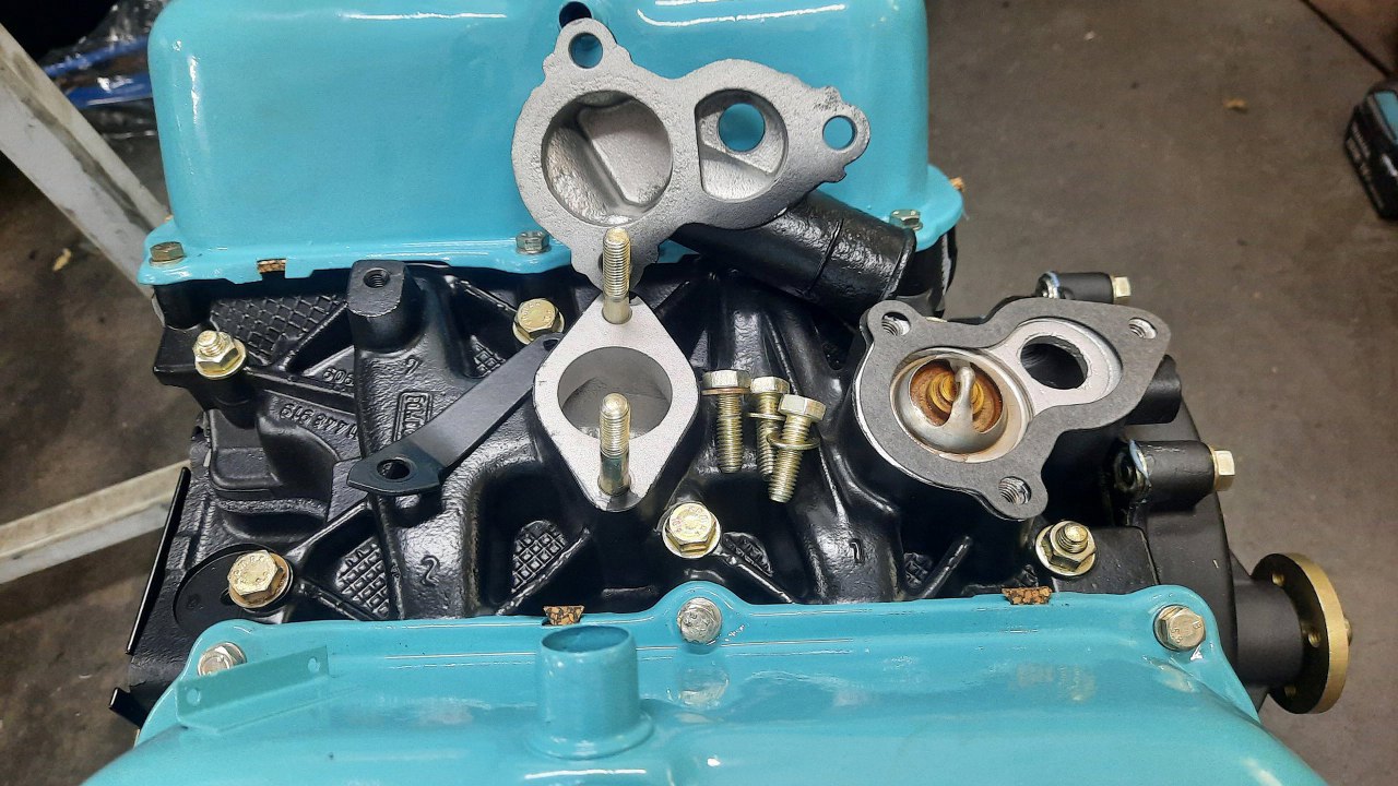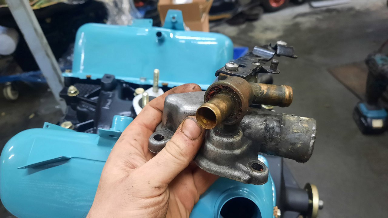 Najpierw przykręcę jeszcze kilka części do silnika. Pokrywkę termostatu wziąłem z części zapasowych przywiezionych przez Michała, jest w lepszym stanie niż ta, co była na silniku. Oczyściłem ją i pomalowałem. Włożyłem na miejsce termostat.