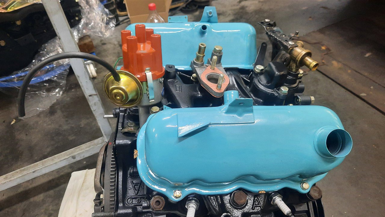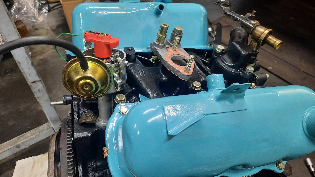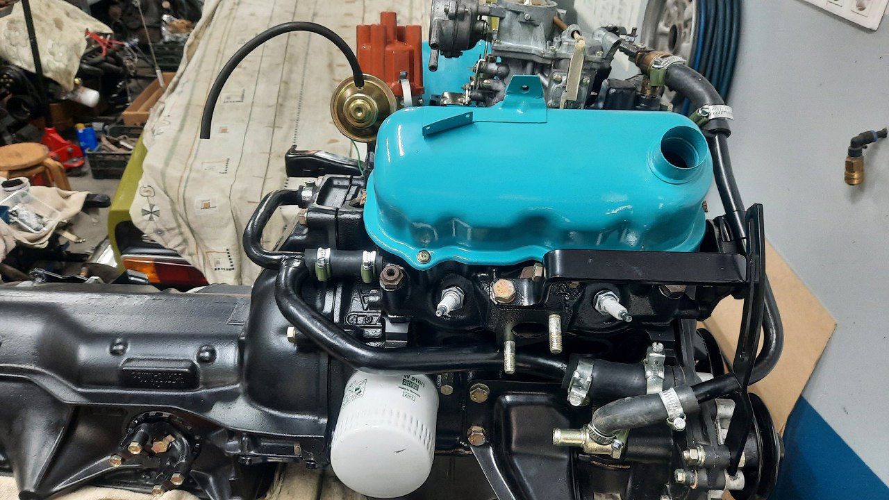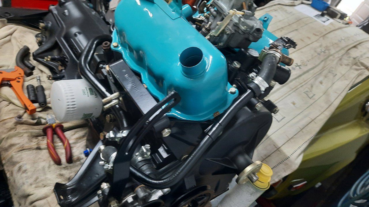 Najpierw przykręcę jeszcze kilka części do silnika. Pokrywkę termostatu wziąłem z części zapasowych przywiezionych przez Michała, jest w lepszym stanie niż ta, co była na silniku. Oczyściłem ją i pomalowałem. Włożyłem na miejsce termostat.