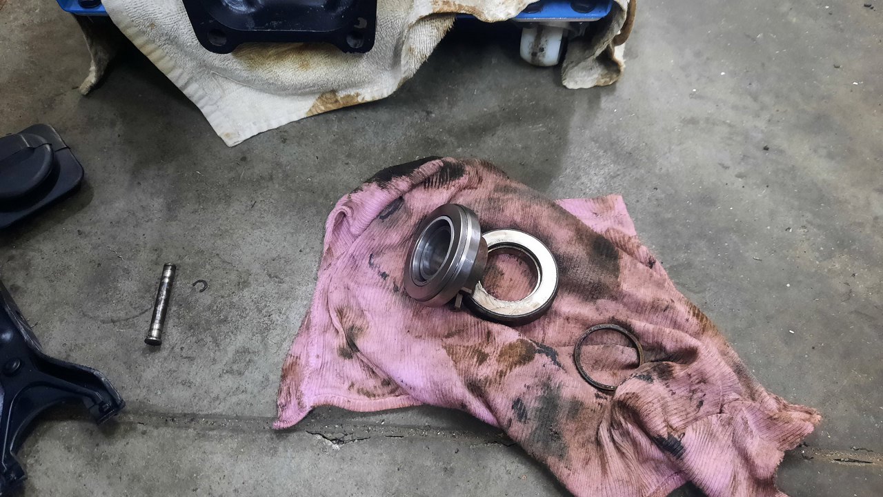Przechodzę wreszcie do tematu skrzyni biegów. Zdjąłem stare łożysko sprzęgła z mocowania. Już chrupało podczas kręcenia, więc trzeba dać nowe.