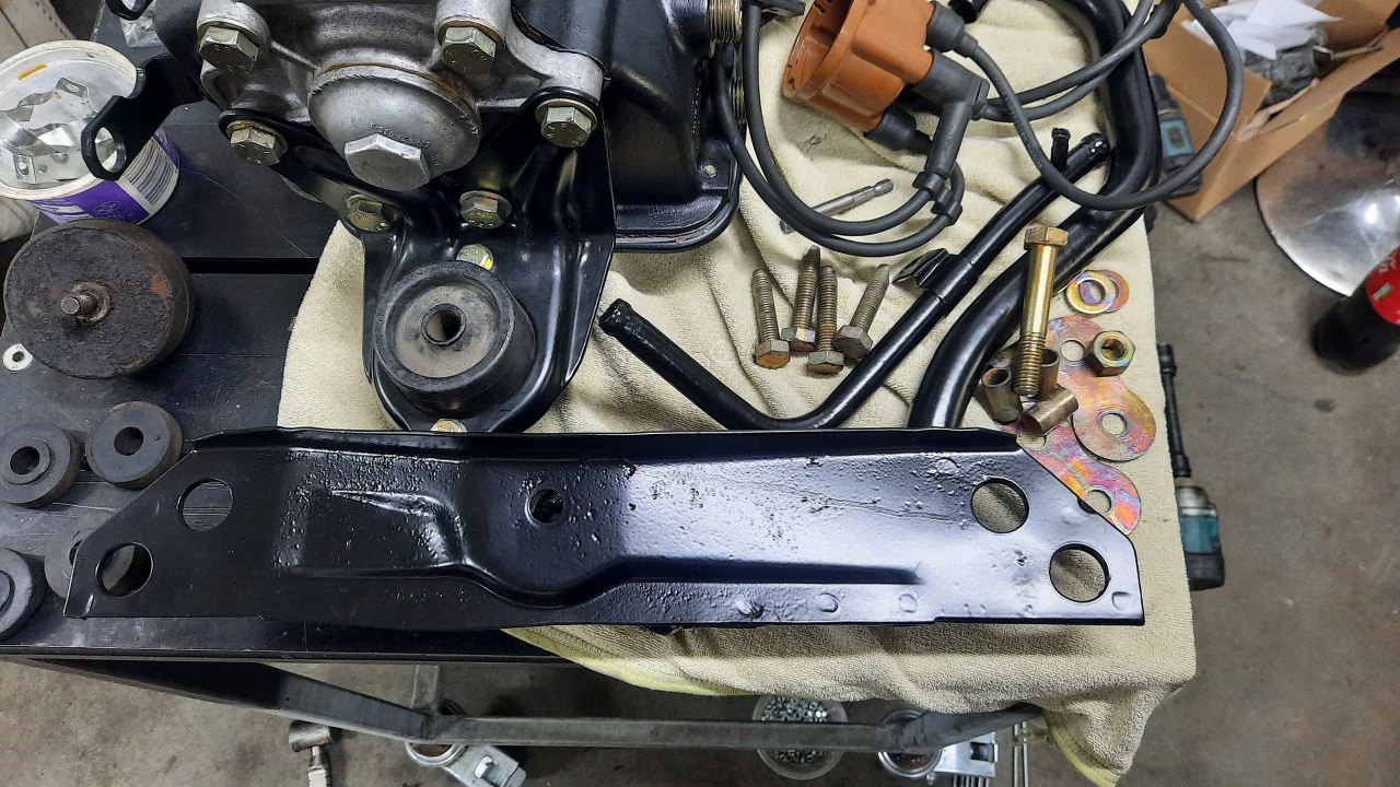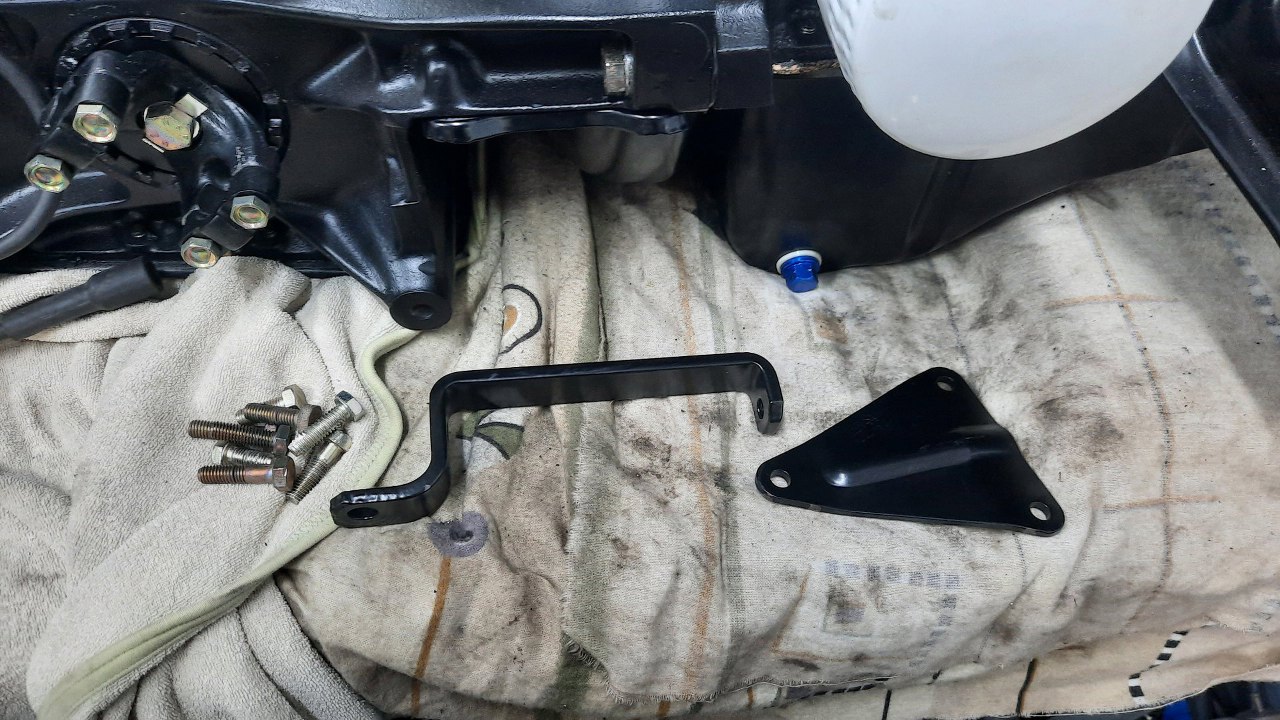 Łapa skrzyni ma ślady wżerów od rdzy, ale wygląda ładnie w nowym lakierze proszkowym. Obok leżą jej śruby i podkładki.