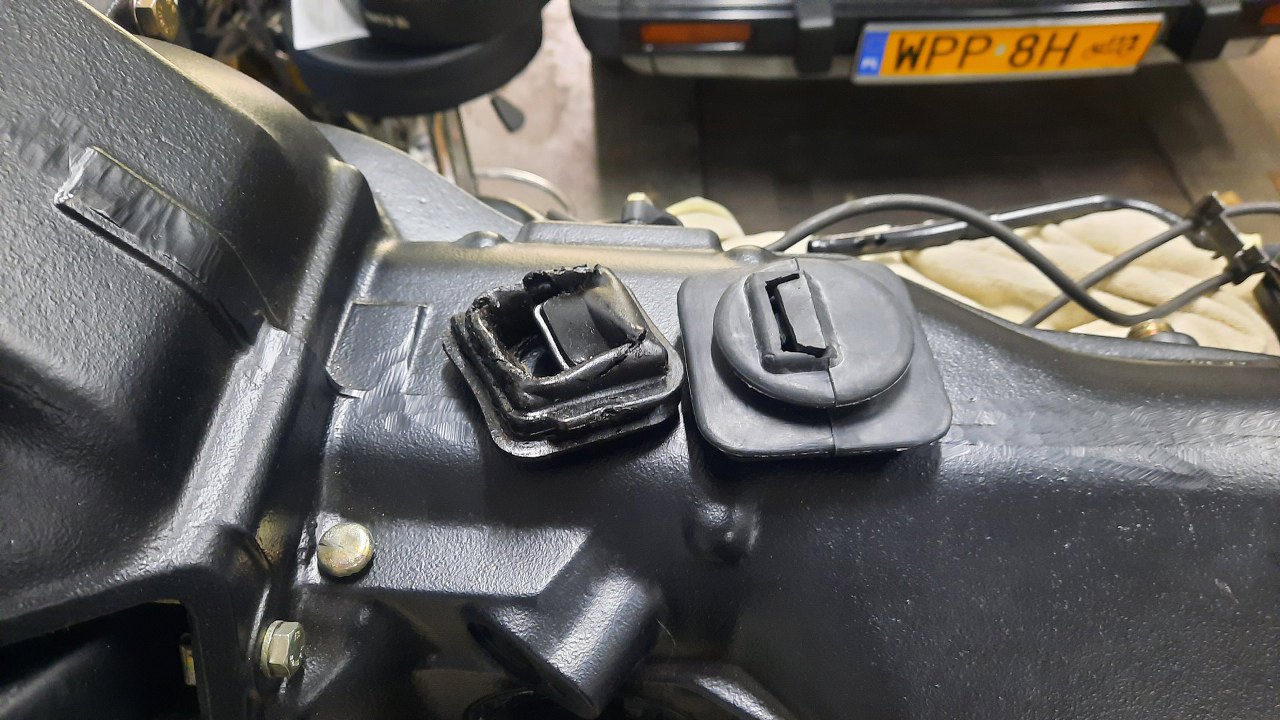Guma osłaniająca łapę skrzyni biegów była już w słabym stanie i ledwo trzymała się na miejscu. Kupiłem nową, reprodukcję. Jest trochę inna, ale pasuje na miejsce.