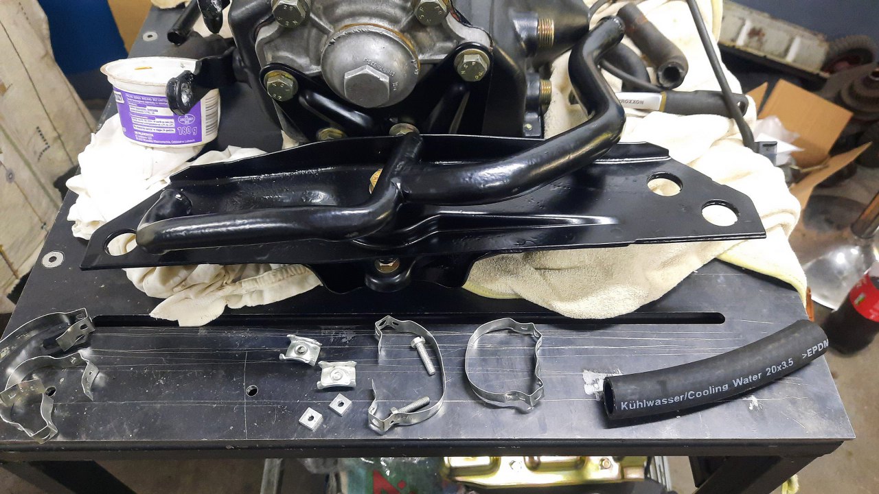 I gotowe. Rurki chłodzenia na miejscu, używając ile się dało oryginalnych cybantów. Jedna rurka idzie od tyłu pompy wody na tył silnika. Druga od tyłu pompy wody na górę, do wyjścia z termostatu. Przykręciłem też mocowanie prądnicy.