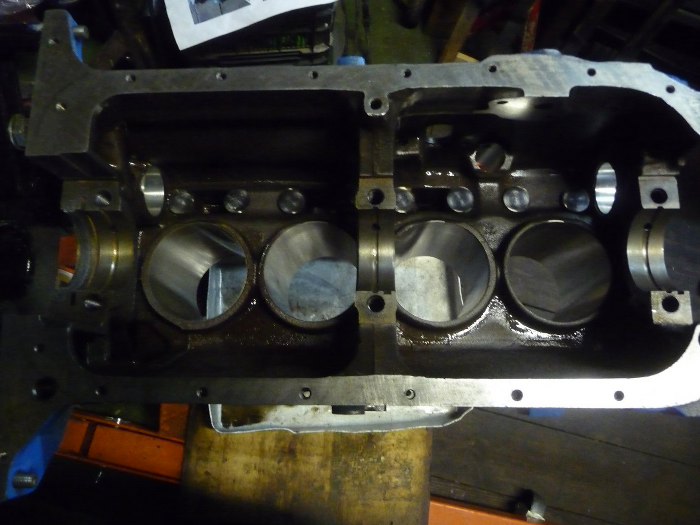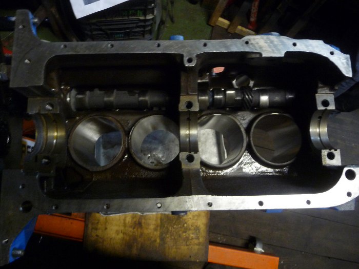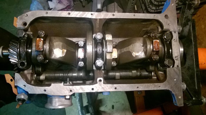 I widok na całość, już z włożonymi tłokami. Wał ma tylko trzy podpory główne.