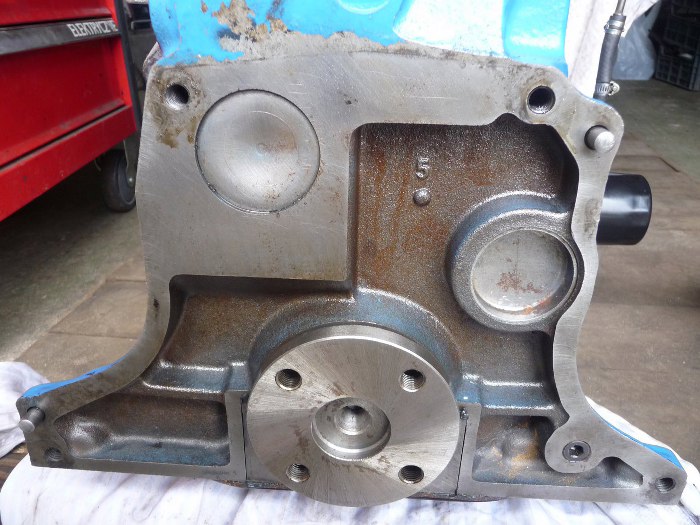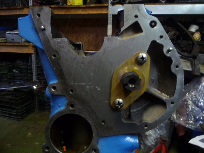 Zaślepka już na miejscu. Wał korbowy ma tylko cztery otwory na śruby mocujące koło zamachowe.