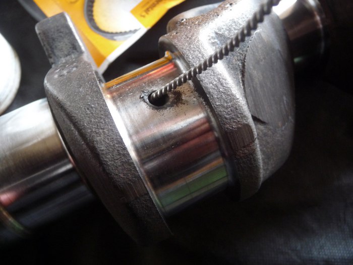 Następnie został porządnie umyty wał korbowy. Tu widać, że nawet w kanałach olejowych trzeba sprawdzić czystość.