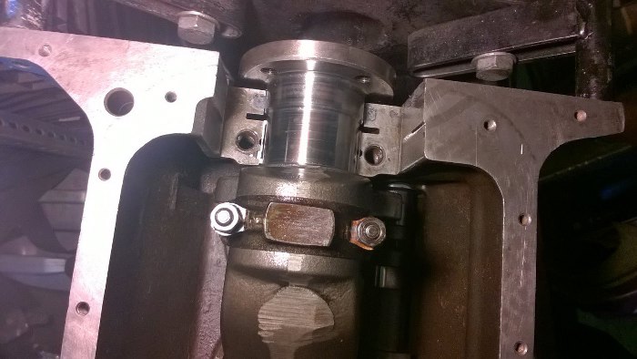Wał korbowy położony już na panewkach głównych. Gniazda w bloku są bardzo głęboko. Na zdjęciu widać też uszczelnienie sznurowe wału.