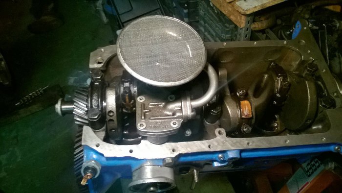 Po dokręceniu korbowodów i stóp wału zamontowałem pompę oleju.