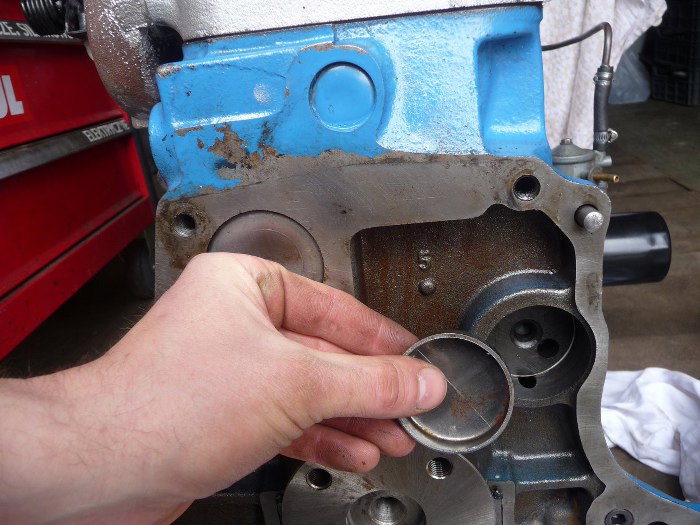 Potem mogłem już zdjąć silnik ze stojaka. Tu trzymam zaślepkę tylną wałka rozrządu - wyjmowałem ją do wymiany panewek.