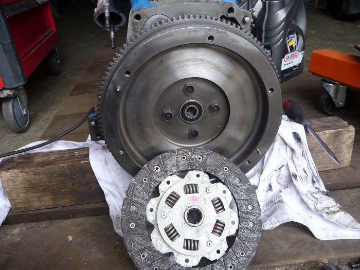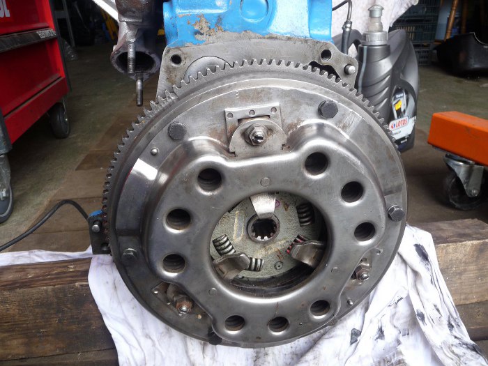 Koło zamachowe przykręcone (koniecznie trzeba dać loctite). Tarcza sprzęgła na gruby wieloklin - widać, że silnik wielkiej mocy/momentu nie ma.