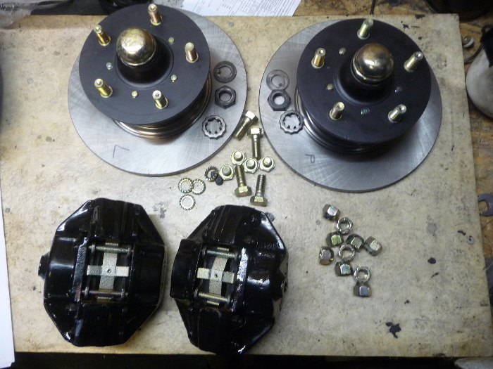 Przygotowałem cały zestaw potrzebny do poskładania przednich hamulców. Zaciski już pomalowane, założyłłem też klocki i zestawy montażowe.