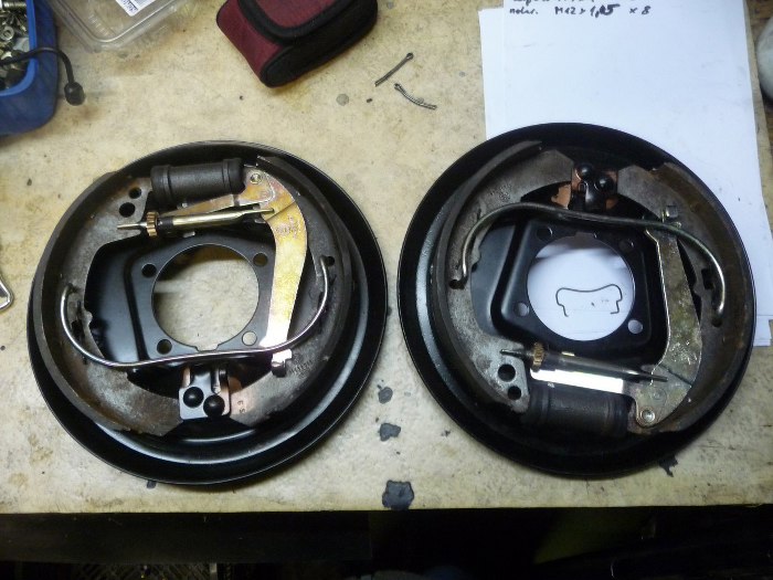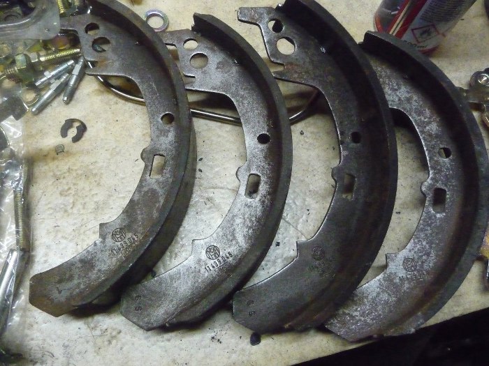 Oczyściłem stare szczęki hamulcowe. Nie są dużo zużyte, więc nie zamontuję nowych, tylko te. Co ciekawe, nie ma tu szczęk przednich i tylnych, jak to zazwyczaj bywa; wszystkie szczęki są jednakowe.