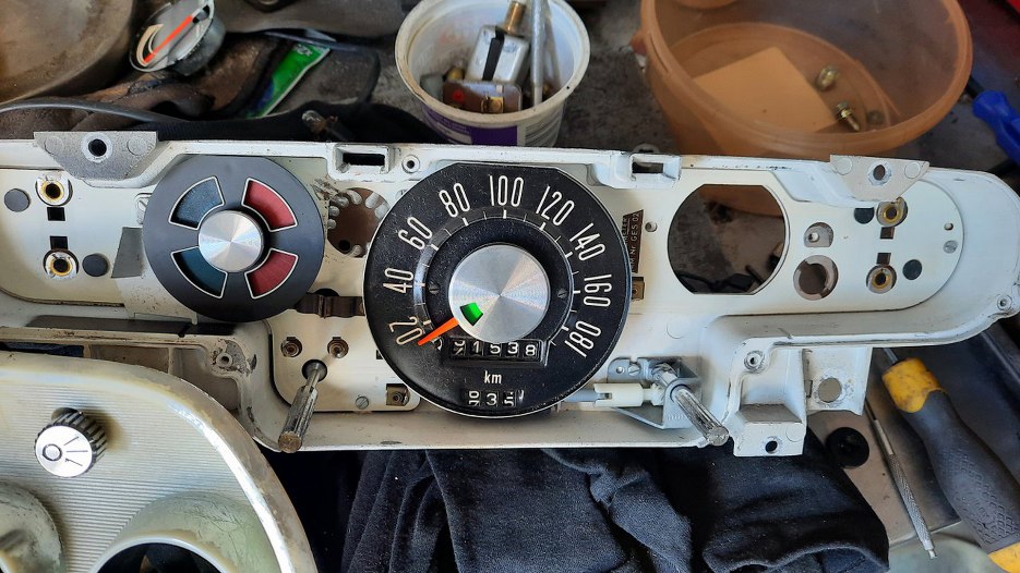 Wymienione zostały wszystkie żarówki - w lampach przednich i tylnych, kierunkowskazach, lampkach oświetlenia tablicy, wstecznej, oświetlenia wnętrza... Potem wyjęte zostały zegary.