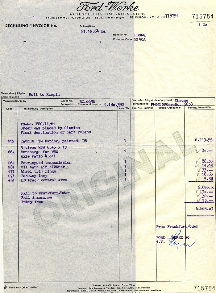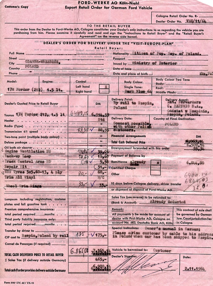 A na deser Robert podesłał mi kilka papierów, które dostał razem z autem. Wstawiam je tu (po wycięciu danych osobowych oczywiście), bo uważam, że to niezły kawał historii. Tutaj jest rachunek z Forda, widać jakie opcje zostały zamówione fabrycznie: