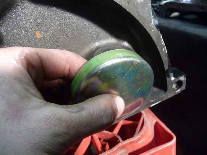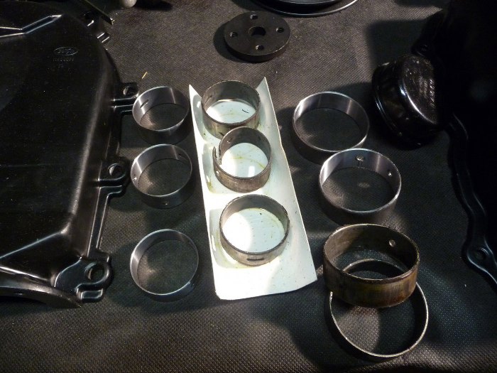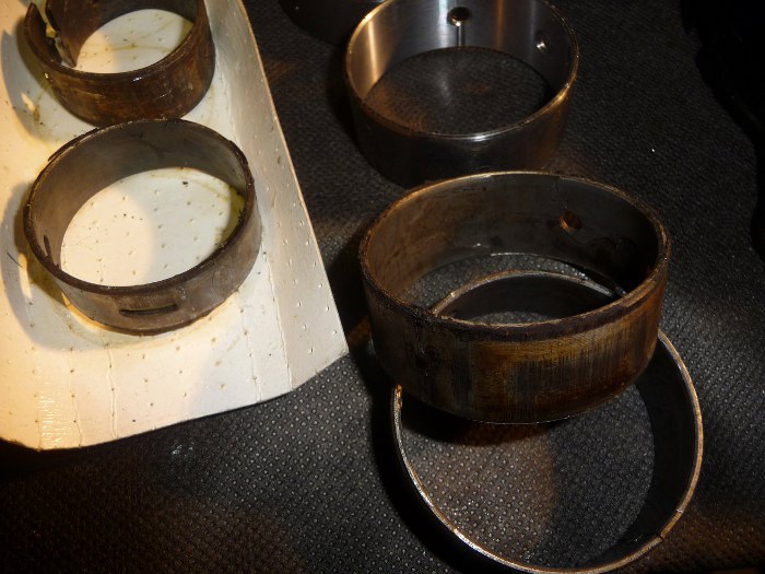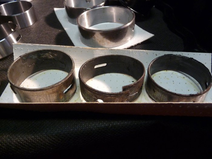 Wyciągnąłem panewki wałka rozrządu. Środkową wyciągnąłem nie w tą stronę, co trzeba i musiałem ją zagiąć, żeby wyszła. Widać jaki syf jest dookoła nich. Poza tym może i wymiar trzymały, ale kruszyły się ze starości - zerknij na tą po lewej stronie, wierzchnia warstwa metalu odchodzi płatami.
