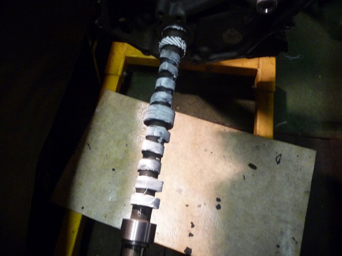 Potem posmarowałem wałek rozrządu smarem montażowym. Dla ułatwienia oparłem go o pierwszą panewkę i dokończyłem smarowanie.