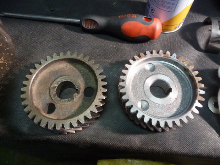 Z wału korbowego zdjąłem stare koło rozrządu. Po prawej jest przygotowane nowe.