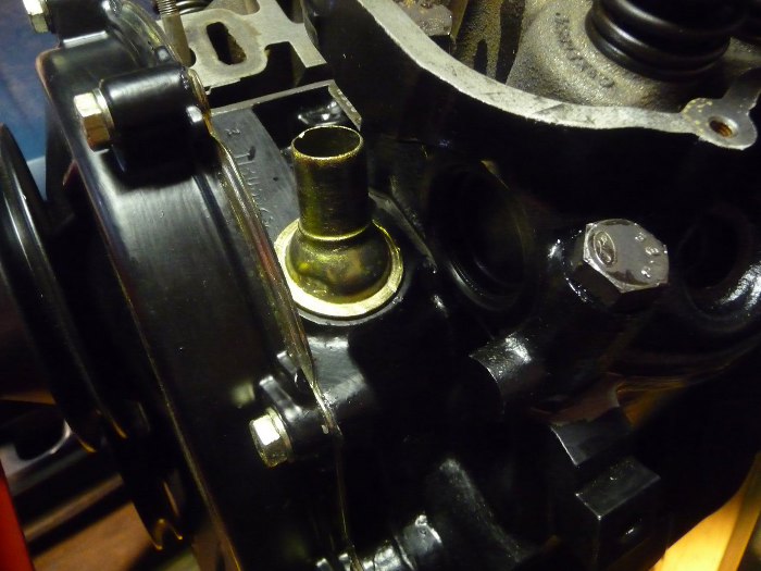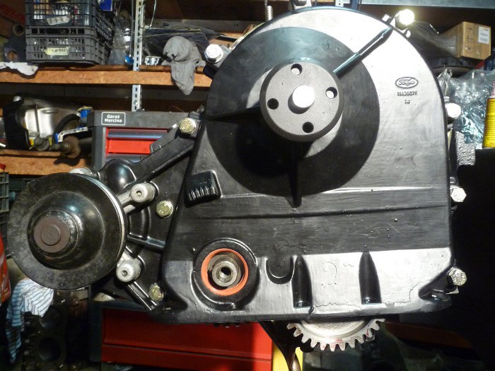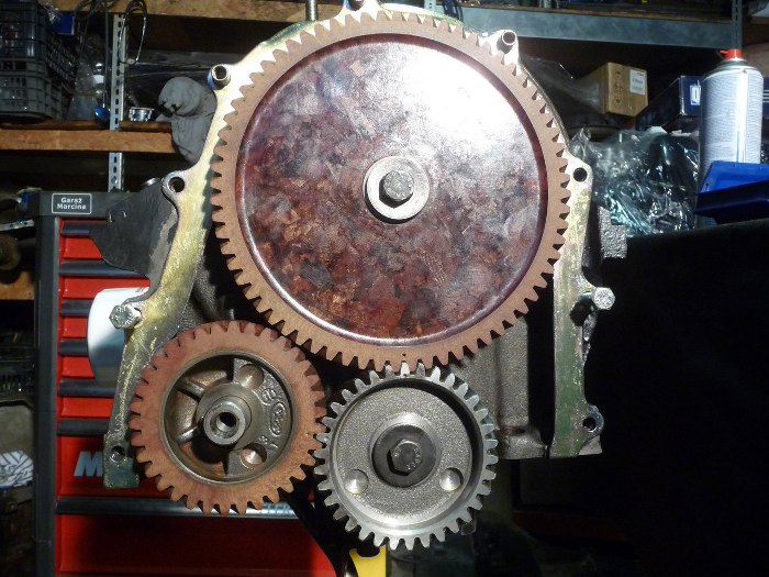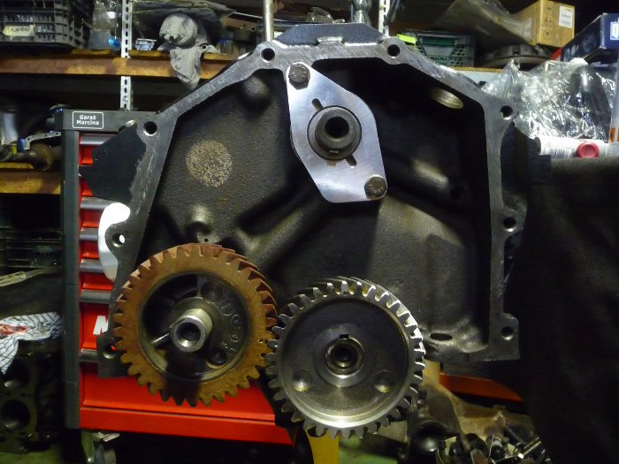 Teraz następuje w tych silnikach mały wyścig z czasem. Posmarowałem uszczelniaczem (nie silikonem! Silikon to zło :) ) uszczelkę i założyłem blachę pośrednią. Blachę przykręca się do bloku dwiema śrubami, które są pod dużym kołem zębatym wałka rozrządu. Następnie założyłem koło wałka rozrządu (śruba oczywiście wkręcona z użyciem kleju do gwintów) pilnując, żeby znaki były we właściwych miejscach. Co ciekawe, to V6 miały również to samo koło wału korbowego, z zaznaczonym punktem do ustalania go z kołem wałka wyrównoważającego, ale nie miały tego wałka. Wtedy trzeba uważać na którą kropkę ustawiamy koło wałka rozrządu :)
