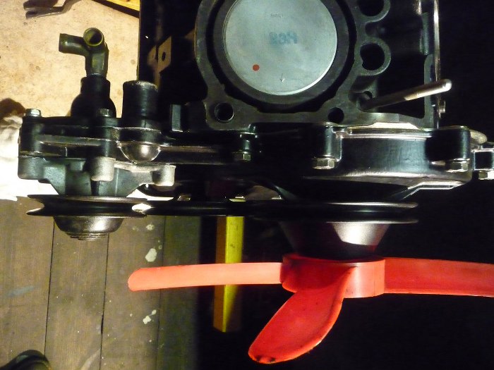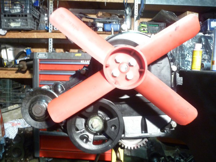 Żeby już mieć z głowy większą część przodu silnika przykręciłem koło pasowe wałka i koło wiatraka razem z wiatrakiem.