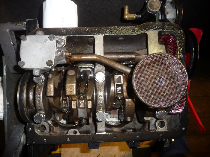 Założyłem gumową uszczelkę tylnej podpory wału (musiałem poszukać w zapasach, bo w zestawie uszczelek, o dziwo, nie było) i uszczelkę miski olejowej. Na sitku smoka pompy oleju widać trochę oleju. Potem przykręciłem miskę olejową.