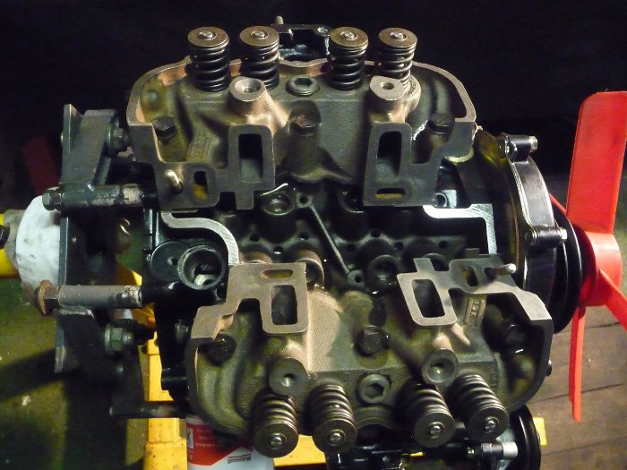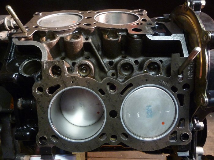 Znalazłem popychacze zaworowe w dobrym stanie z innego silnika, ponieważ wyjęte z tego były za bardzo zużyte. Wcisnąłem też tulejki ustalające głowice w blok. Na zdjęciu widać też założone na miejsce uszczelki pod głowice i wkręcone dwie szpilki kolektora dolotowego.