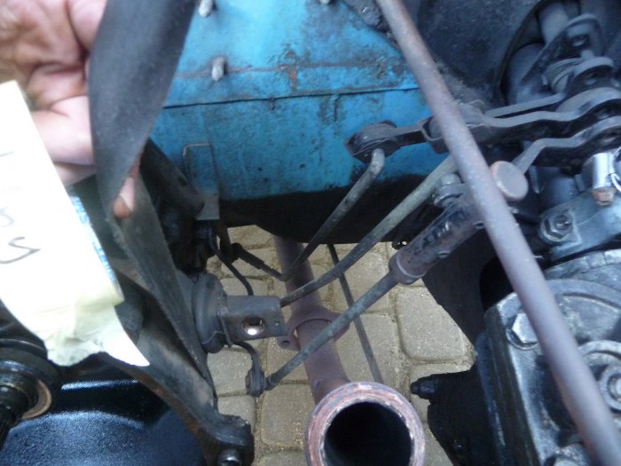 Tu widać wodziki łączące mechanizm wybieraków w skrzyni biegów z dźwigniami wychodzącymi z kolumny kierownicy.