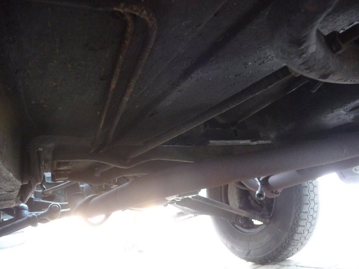 Niestety słabo widać. Łapa skrzyni biegów jest szeroka, mocowana jest do podłużnic. Widoczny przechodzący przez nią pręt jest częścią mechanizmu hamulca postojowego.
