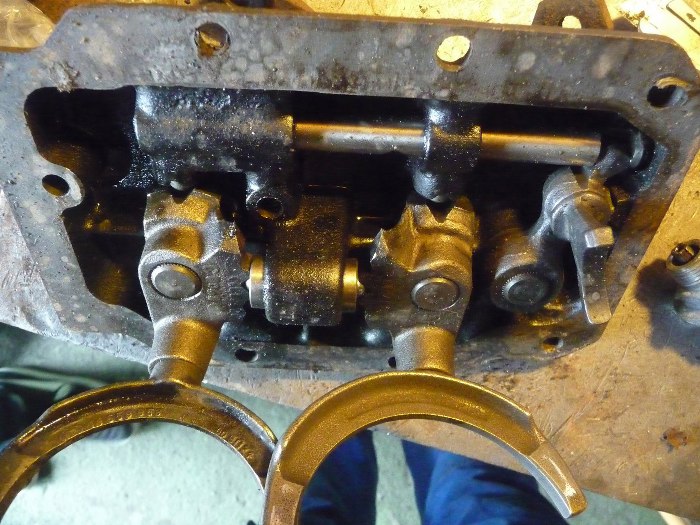 Pokrywa boczna skrzyni zawiera w sobie mechanizmy wybieraka biegów. Te dwa duże półksiężyce to wybieraki 1/2 i 3/4 biegu, a ten mały - wstecznego.