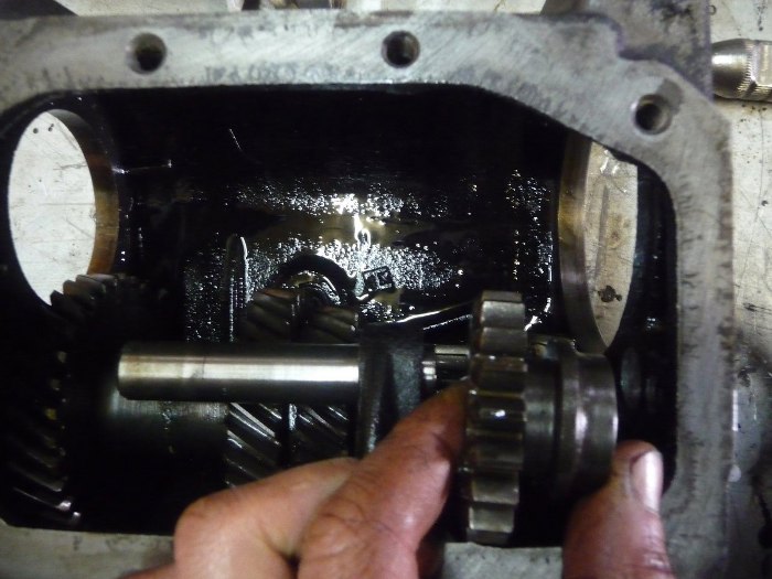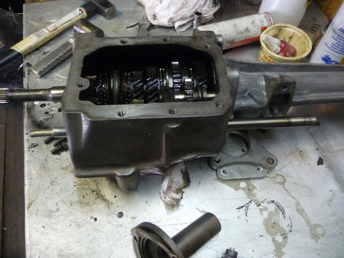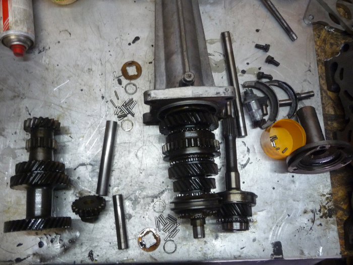 Zacząłem nieco niezgodnie z instrukcją - ta skrzynia jest prawie identyczna z późniejszymi, więc rozkładam ją właściwie w tej samej kolejności i sposobem co te nowsze, bo jest mi tak łatwiej, a poza tym mam dorobione inne przyrządy. Najpierw wysuwam wałek, na którym obraca się "choinka" (główna zębatka skrzyni).