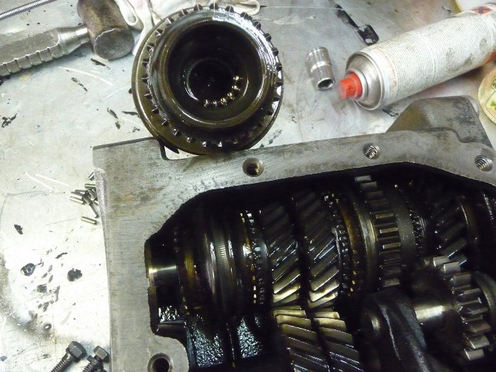 Potem trzeba uważać, bo wałek, na którym obraca się widoczne na zdjęciu zdemontowane kółko zębate wstecznego biegu, ledwo się mieści obok choinki. Dobrze by było nie złamać żadnych zębów (skrzyni) podczas demontażu :)