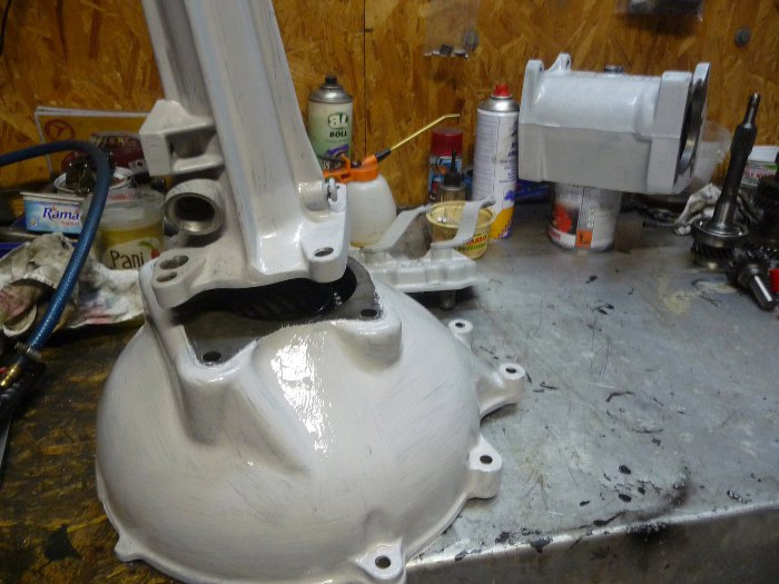 Rozpędziłem się i pomalowałem też dzwon skrzyni (obudowę sprzęgła) i ogon. Ogon fabrycznie był zostawiony w surowym, niemalowanym aluminium (miejscami tylko był maźnięty czarną farbą, jak Wilhelmowi w fabryce się pędzel omsknął z obudowy), ale żeby zabezpieczyć je przed utlenianiem się i żeby było łatwiej wytrzeć w przyszłości ewentualne zabrudzenia też go pomaluję.