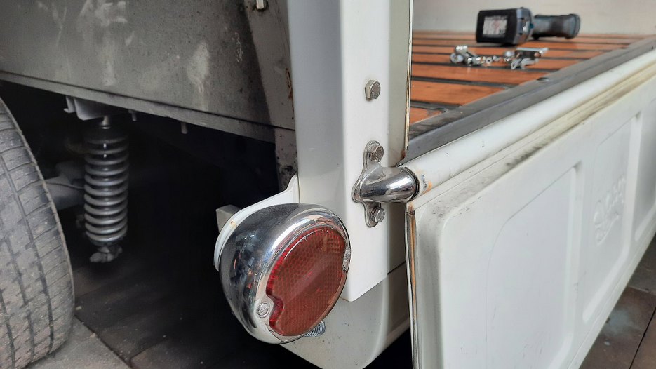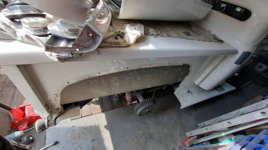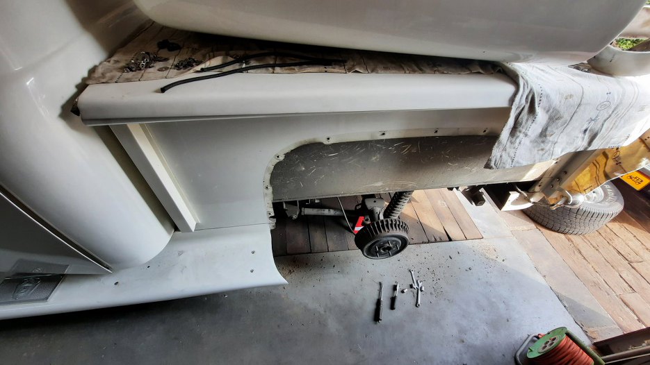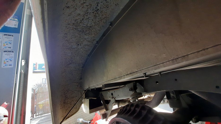 Progów jednak nie mogę jeszcze zdjąć, bo trzymają je trochę błotniki tylne. Błotniki przykręcone są do skrzyni. Z tyłu mają jedno wzmocnienie.