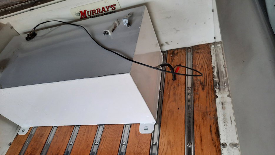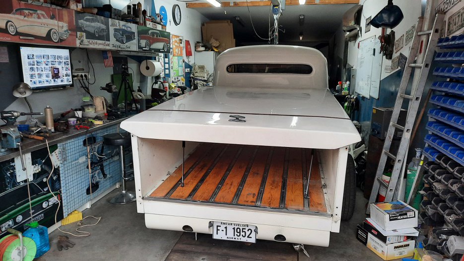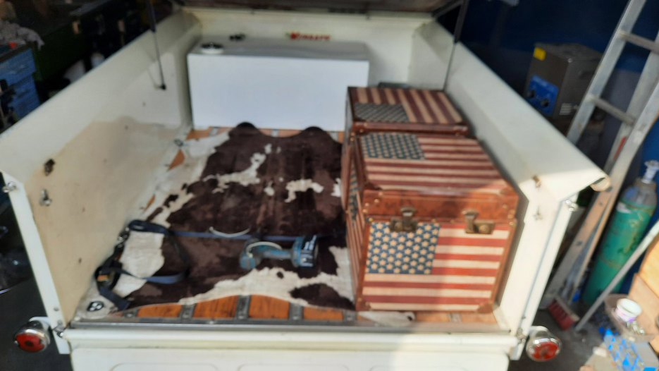 I po uchyleniu do góry pokrywy (znowu laminat) mamy widok co jest w skrzyni ładunkowej. Skrzynie przykręcone są do desek podłogi wkrętami, krowa przytrzymana jest skrzyniami i drobnymi uchwytami do ładunku. Prostopadłościan z przodu to zbiornik paliwa. Oryginalnie był za siedzeniami, ale został z tamtąd wywalony, bo było mało miejsca w kabinie. Otwór po wlewie w prawym tylnym słupku trzeba będzie zaspawać, to pokażę później.
