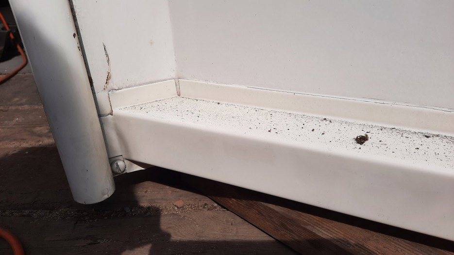 I widok z zewnątrz. Skrzynia stoi na przedniej burcie (z podłożonymi deseczkami oczywiście), śruba z płaskim łebkiem wkręcona jest w poprzeczną część skrzyni.
