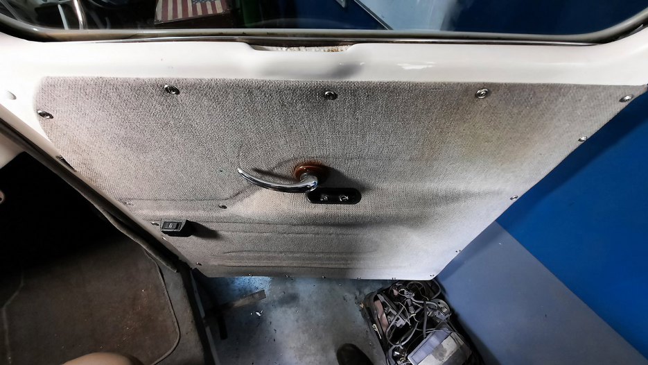 Postanowiłem zatem zdjąć boczek z drzwi, żeby zobaczyć, czy może te cztery kółka na zawiasie od strony drzwi to są śruby a nie nity.