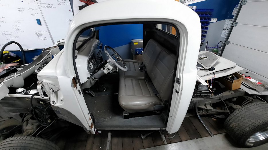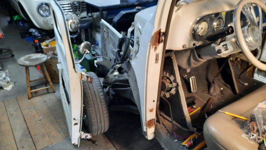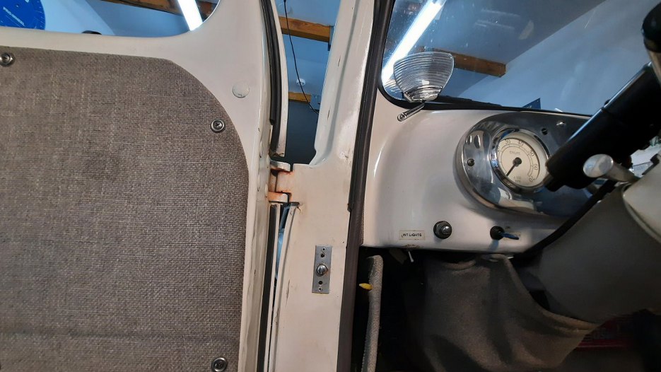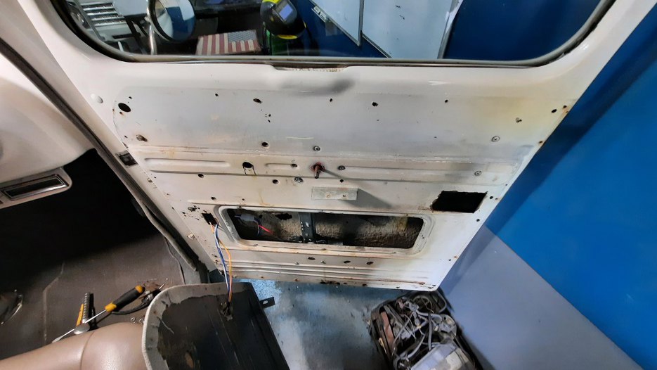 Następną rzeczą, którą chciałem zrobić, to było zdjęcie drzwi z kabiny. Po otwarciu trochę się zdziwiłem, bo zazwyczaj zawiasy są do karoserii przykręcone. A tu nic.