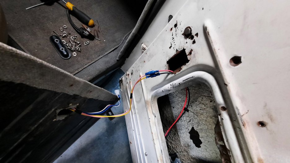 Włącznik szyb elektrycznych do instalacji kabiny podłączony był poprzez kostkę z konektorami, ale już do silniczka szyby - na stałe, złączkami zaciskowymi. Nie będę się już rozpisywał na temat uroku niefabrycznych otworów...