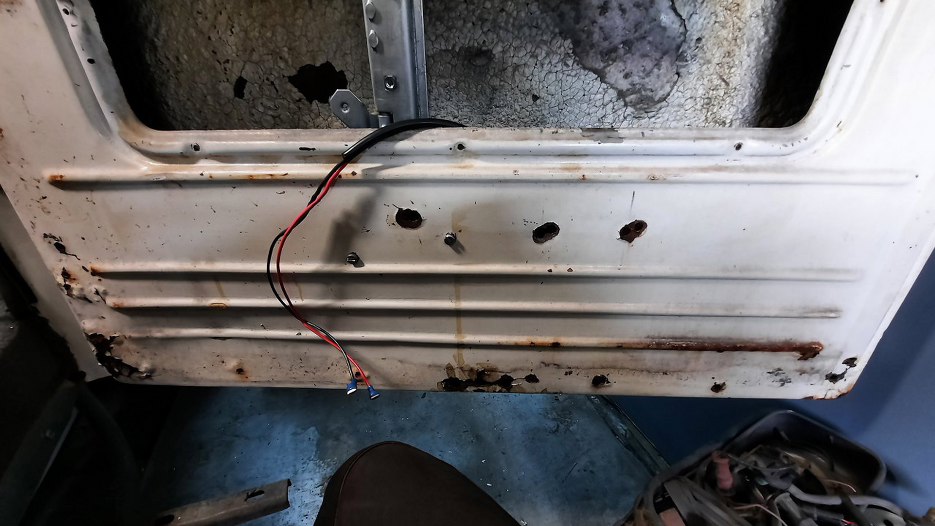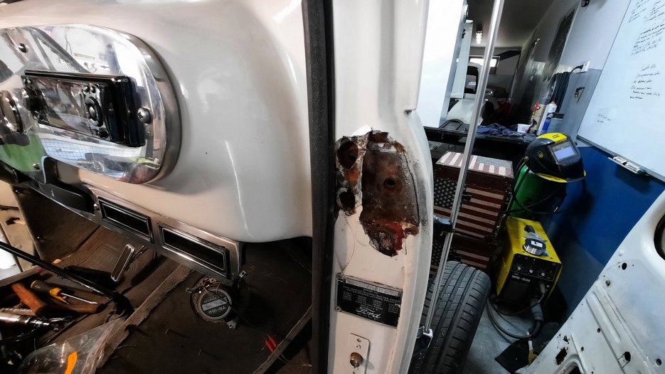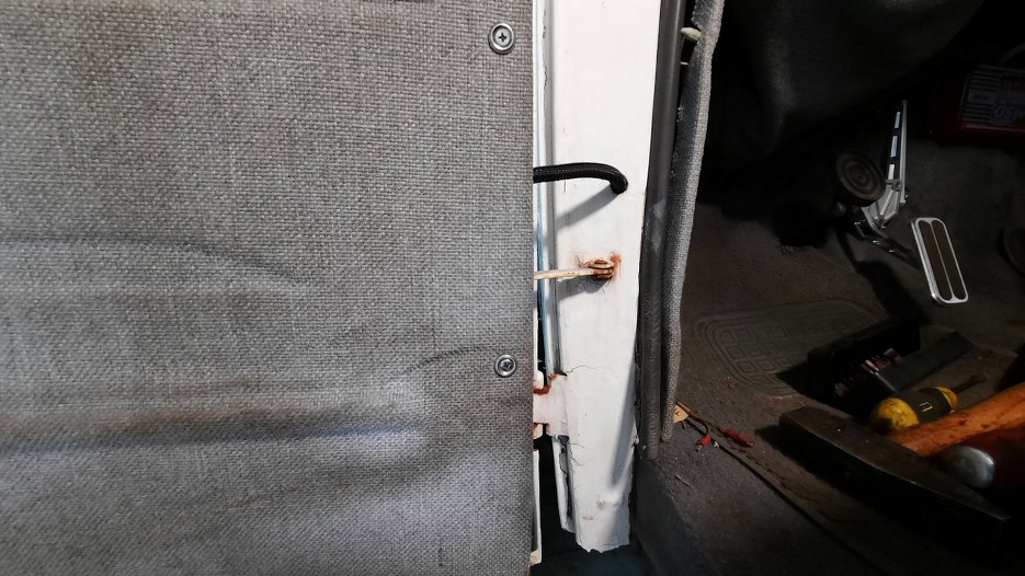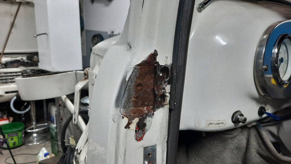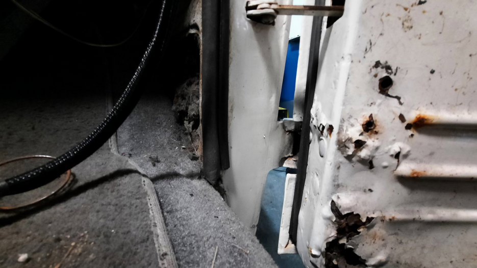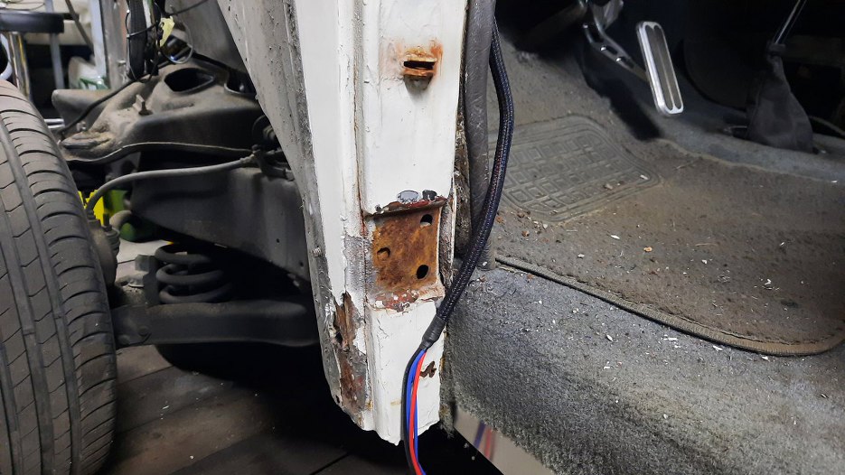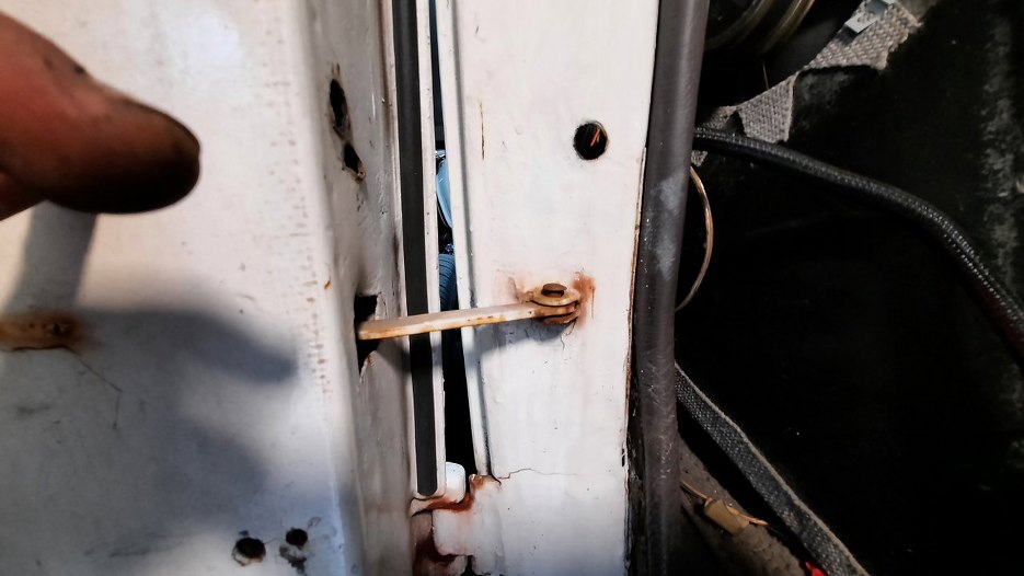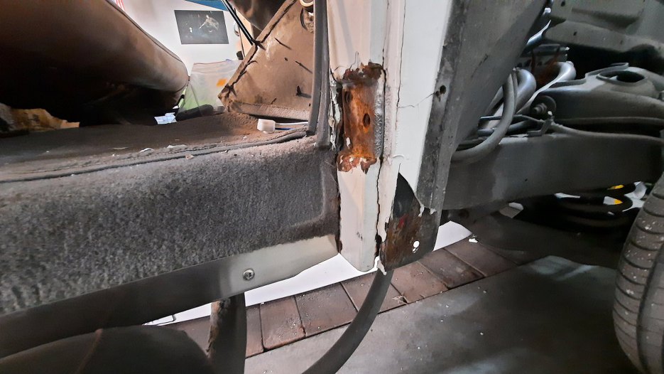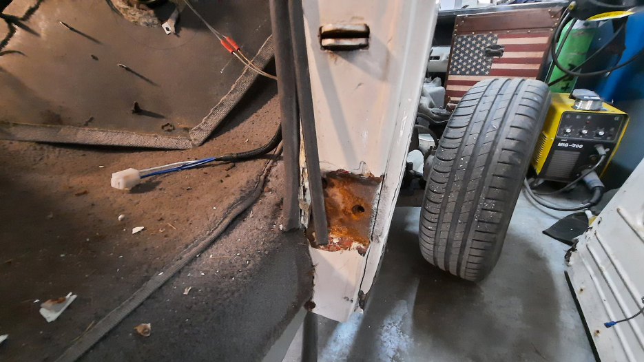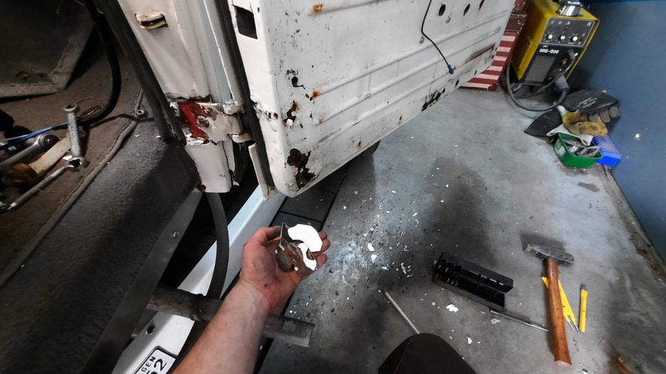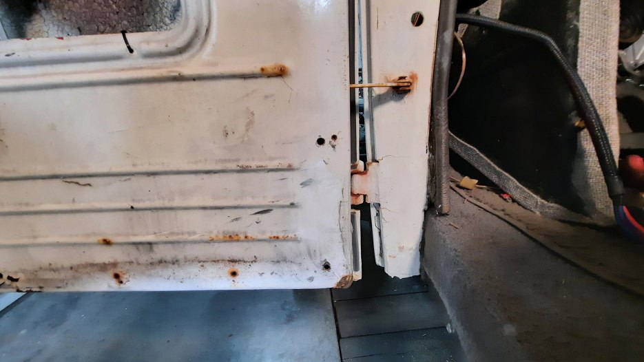 Przy dolnym zawiasie bardzo dużo korozji. W każdym razie okazło się, że zawiasy do drzwi są nitowane na gorąco i nie ma opcji tego tu prosto oddzielić. Myślałem przez chwilę o wybiciu pinu z zawiasu, ale też jest zakuty. Nawet wyszukałem w internecie jak to zdjąć, ale, zgodnie z moją wiedzą, napisane było - odkręcić. No ale tu nie ma śrub!!!
